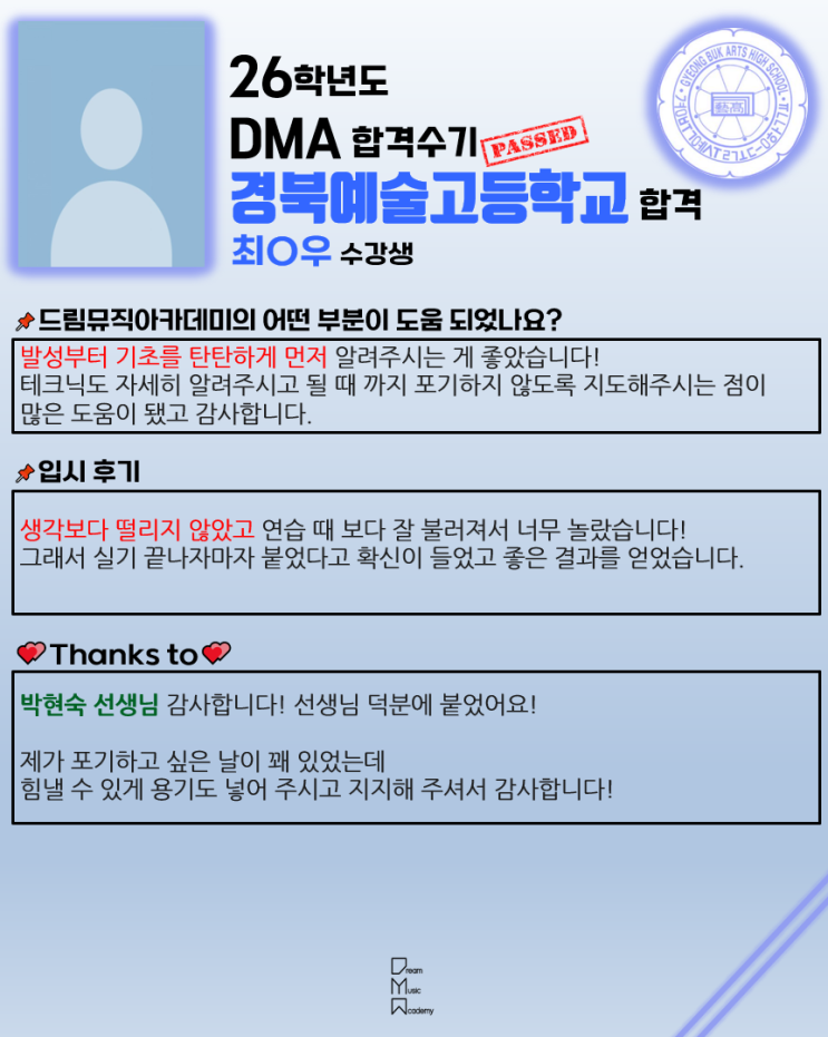 #경북예술고등학교 #실용음악과 #보컬 #합격 #수기 #후기 #경북예고보컬입시 #경북예고실음과입시 #경북예고입시 2026학년도 경북예술고등학교 실용음악과 보컬 합격 DMA 수강생 : 최시우 입시 지도 잘 해주신 보컬 파트 : 박현숙 선생님 감사합니다 ✔경북예술고등학교 실용음악과 입시 문의는❗ 대구 드림뮤직아카데미❗❗ 여기로 문의해 주세요 ✅우리 대구 드림뮤직아카데미 에서는 음악 취미, 전문, 오디션, 입시 등 모든 과목을 체계적으로 배우고 준비할 수 있습니다! 대구 실용음악학원, 보컬 학원은 드림뮤직아카데미 ✅보컬 진단으로 수강생 맞춤별 강사님 배정 + 원장님, 부원장....... <img src="https://blogthumb.pstatic.net/MjAyNTEyMDlfMjg3/MDAxNzY1MjcxOTI1MDAx.wPKEzd9iF8gVlYISJqe6hUYnxMbFIEE3KoOn32vPIBYg.cLOj7TPDnlUoad0_AxbIV6BiW5Nd7wMpD9bYiS49d_sg.PNG/%C8%C4%B1%E23.PNG?type=s3" />