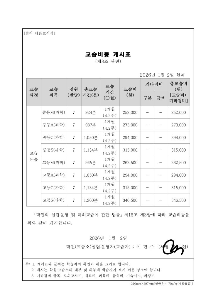 교습비등 게시표