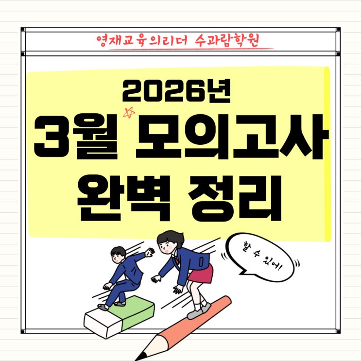 창원고등수학학원 수과람학원 2026년 3월 모의고사 완벽 정리 고1·고2·고3 반드시 알아야 할 시험 의미 3월 전국연합학력평가는 고등학교에서 한 해의 공부 방향을 결정하는 첫 시험입니다. 많은 학생들이 “모의고사 한 번” 정도로 생각하지만 실제로는 -현재 수능 위치 확인 - 약점 과목 분석 - 공부 전략 수정 을 위해 매우 중요한 시험입니다. 특히 고등학교에서는 내신과 수능 준비가 동시에 진행되기 때문에 3월 학평 결과를 어떻게 해석하느냐가 이후 학습 방향을 크게 좌우합니다. 2026년 3월 모의고사 일정 2026년 첫 전국연합학력평가는 다음과 같이 진행됩니다. 시험일 2026년 3월 24일 (화) 대상 고1 · 고2 · 고3 시험 과목 국어 수....... <img src="https://blogthumb.pstatic.net/MjAyNjAzMDhfMTMz/MDAxNzcyOTM2NjE5NTgw.9Ct337grd3I20HMYLQmuU_wLTEQikad5YBQa0y4iXCQg.t9rp2__DlraAXotaWo1TS24t2lxYywIuE8iknLa-3okg.JPEG/%C1%A6%B8%F1%C0%BB-%C0%D4%B7%C2%C7%D8%C1%D6%BC%BC%BF%E4_-001_-_2026-03-08T112257.224.jpg?type=s3" />
