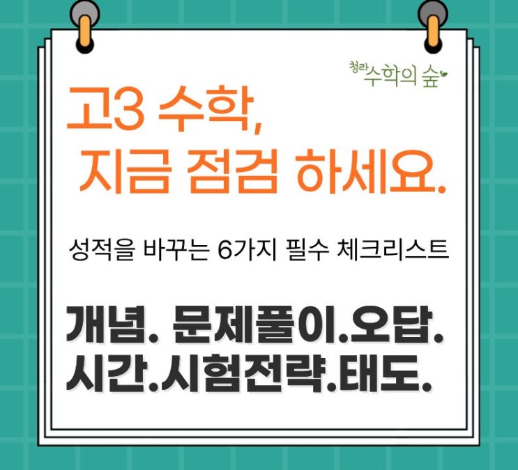 고3이 되면 “열심히”보다 “제대로”가 더 중요해집니다. 아래 체크리스트를 보면서, 지금 나의 수학 공부 상태를 하나씩 점검해 보세요. 1. 개념 체크 이 단원의 공식을 바로 말할 수 있나요? 그 공식을 문제에서 어떻게 사용하는지 설명할 수 있나요? 헷갈리는 개념은 따로 표시해 두었나요? 개념은 단순히 “아는 것”이 아니라, 문제에 바로 적용할 수 있어야 진짜 실력입니다. 2. 문제풀이 체크 문제를 보자마자 첫 접근 방법이 자연스럽게 떠오르나요? 항상 막히는 구간이 비슷하게 반복되지는 않나요? 같은 유형의 문제를 계속 틀리고 있지는 않나요? 문제를 많이 푸는 것보다 더 중요한 것은, 비슷한 문제에서의 실수를 줄이는 것입니....... <img src="https://blogthumb.pstatic.net/MjAyNjAyMTNfMTc0/MDAxNzcwOTYwOTEzOTE1.vs80TlPv-W_RnMXIPLcsLYNR_kAzlTJKbVHPk4nGYdYg.P85AB2TbiPfjjDjdQ-1jRyGsCU_YxZCz6bFtcvelMIcg.JPEG/%C1%A6%B8%F1%C0%BB_%C0%D4%B7%C2%C7%D8%C1%D6%BC%BC%BF%E4._%2832%29.jpg?type=s3" />