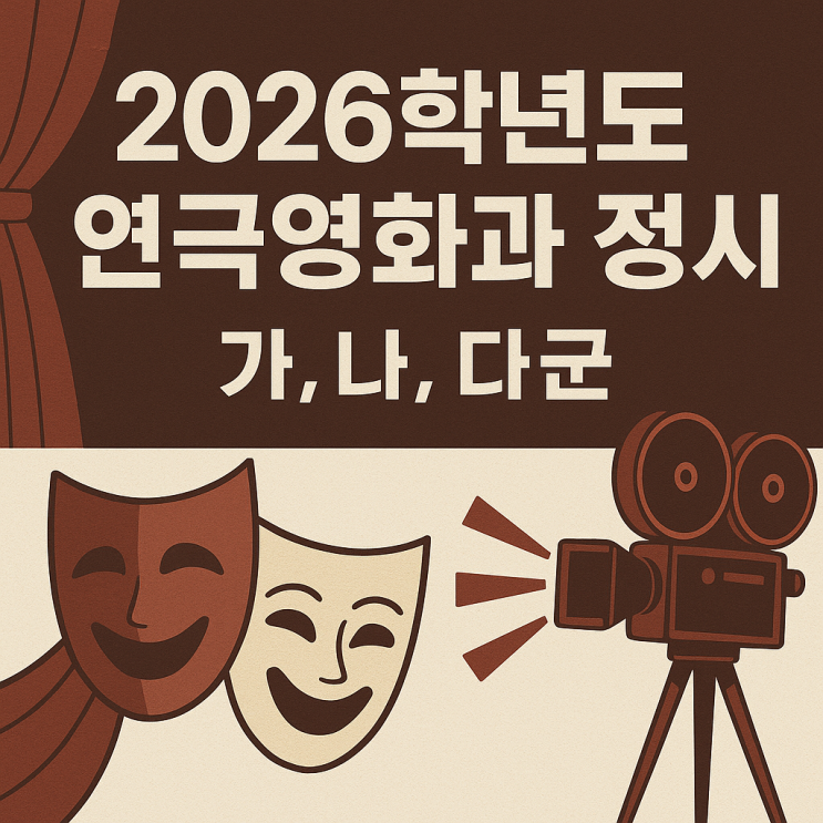연극영화과 정시를 준비하는 학생이라면 한 번쯤 이런 생각을 해봤을 겁니다. “학교는 이렇게 많은데 나는 대체 어디를 써야 하지?” 정시 상담을 하다 보면 의외로 가·나·다군 구조를 정확히 이해하지 못한 채 지원부터 고민하는 학생들이 정말 많습니다. 정시는내 성향에 맞는 학교를 얼마나 정확히 고르느냐’가합격을 좌우합니다. 오늘 우선 가나다군 리스트를 같이 확인해보고 그리고 “나는 어느 쪽이 맞는 학생인가”를 짚어보겠습니다. [가군] 단국대학교 (연극전공(연기),뮤지컬전공) 백석대학교 (연기예술전공,뮤지컬전공) 신한대학교 (공연예술학과 전공) 예원예술대학교(연극전공) 중부대학교(연극영화학전공 연기) 청주대(연극전공....... <img src="https://blogthumb.pstatic.net/MjAyNTEyMDFfMTk0/MDAxNzY0NTg4MzI3NjE2.H8o7nBle_GN1aNAbzAX1xNi-8iAjBKKxSXSXyD1uK5Yg.YZriCwGDgcTToaUOmBVT7YaRG0z1MIMzQZg4A-0cyAYg.PNG/ChatGPT_Image_2025%B3%E2_12%BF%F9_1%C0%CF_%BF%C0%C8%C4_07_17_56.png?type=s3" />