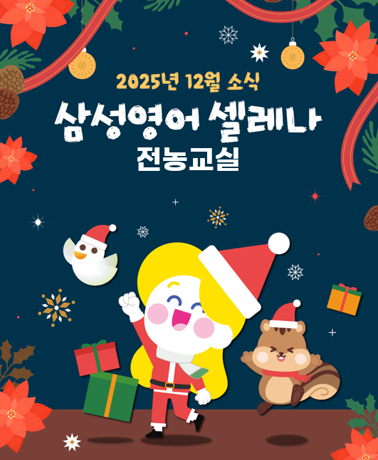안녕하세요:)) 삼성영어셀레나 전농교실 제인쌤입니다. 어느덧 2025년의 마지막 달, 한해의 마지막 달, 아쉬움과 시원함이 공존하는 달이지만 새해를 기다리는 설레임으로 12월 소식 전해드립니다. 학원일정 삼성영어셀레나 전농교실은 월 20일 수업을 원칙으로 합니다. ( 중등부 주3회는 12일 ) 12월 일정 개강: 12월 1일(월) 종강: 12월29일(월) 결석시 또는 수업시간 변경시 미리 연락부탁드립니다. 병결(독감)개인 사정으로 인한 결석은 보강으로만 대체됩니다. 원할한 수업진행을 위해 시간 약속을 지켜주세요. 학원겨울방학은 12월 30일(화)~31(수)입니다. 2026년 1월 2일(금) 정상수업입니다. 학원소식 겨울방학특....... <img src="https://blogthumb.pstatic.net/MjAyNTEyMDFfMzEg/MDAxNzY0NTk5MjE4NDYz.zLJz6lxnBX_YyKCLPJSyzywaDda4uvZaLSYmdm2fu-Mg.n9KluW9L46xXKHHlqYYwGZrGTpXdCcAg0jVKPD0syygg.PNG/%BD%BA%C5%A9%B8%B0%BC%A6_2025-12-01_232645.png?type=s3" />