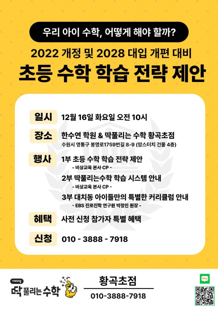 “우리 애 수학, 지금 이대로 괜찮은 걸까?” “개념은 안 잡힌 것 같고, 문제는 늘 비슷하게 틀리고…” “학원은 다니는데 뭘 배우는지 잘 모르겠어요.” 많은 학부모님들이 이런 고민을 하고 있습니다. 그래서 이번 설명회는 ‘우리 아이에게 꼭 필요한 것만 알려주는 현실적 안내서’ 가 될 것입니다. (설명회에 대한 내용은 중간에 있습니다.) 비상교육의 딱풀리는수학, 왜 다른가요? 비상교육은 ✔ 전국 7천여 학원·학교가 사용하는 콘텐츠, ✔ 수학 개념부터 사고력까지 아우르는 교재력, ✔ 교육과정 분석에 기반한 학습 로드맵 으로 이미 현장에서 가장 높은 신뢰를 받고 있습니다. 그중에서도 딱풀리는 수학은 비상교육이 직접 만....... <img src="https://blogthumb.pstatic.net/MjAyNTEyMTBfMTE1/MDAxNzY1MjkyODg0NTkw.EFrjcYzCWB7HsDA4e6nG4UjnF1_a7LT9SF-20N1wJAcg.ULV6P2g3N9XVgEH481Tclzk6MVyvL41Y7jmrrDbRFOIg.JPEG/%BC%B3%B8%ED%C8%B81.jpg?type=s3" />