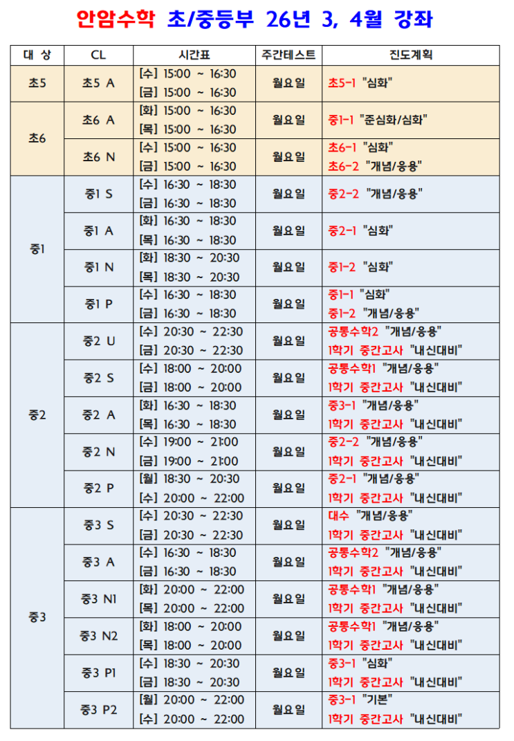 안암수학 3~4월 시간표 최종 확정 (내신 1등급 대비)