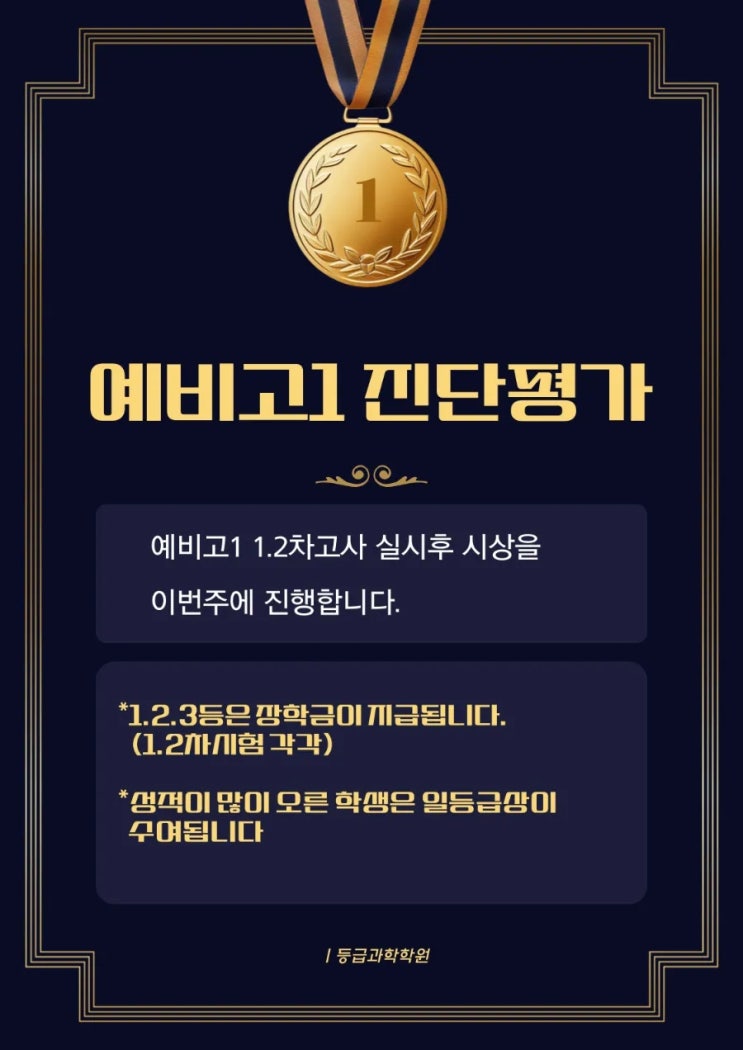 예비고1 반 1차.2차 진단평가가 시행되었습니다. (11월개강반기준) 시험성적은 20등까지 학원게시판에 공지가 되었습니다 1.2.3등은 장학금이 온라인 상품권으로 이번주에 학생에게 보내집니다.(부모님께 내역안내드립니다) 1등급상은 성적이 많이 오른학생에게 주어집니다. 학원에서 상품으로 학생에게 드립니다! 마지막 시험도 더욱 열심히 준비하길 바랍니다!!! (11월개강반 기준) 12월에 개강반도 추후 진단평가는 실시할 예정입니다. 그반에서 성적우수자가 있다면 1등급상이 수여될 예정입니다!! <img src="https://blogthumb.pstatic.net/MjAyNjAxMjdfOTQg/MDAxNzY5NDg2NDQyNjQz.bwRR9mjQHZw58hkH3-vg-j1uOd4i9g4FyAU0iTIFiMQg.x7n0rjkhBcZtEjMcmw-T-6EVg3rwYMAzUFKBOPGl1OEg.JPEG/900%A3%DF%C1%A6%B8%F1%C0%BB%A3%AD%C0%D4%B7%C2%C7%D8%C1%D6%BC%BC%BF%E4%A3%DF%A3%AD001%A3%A89%A3%A9.jpg?type=s3" />