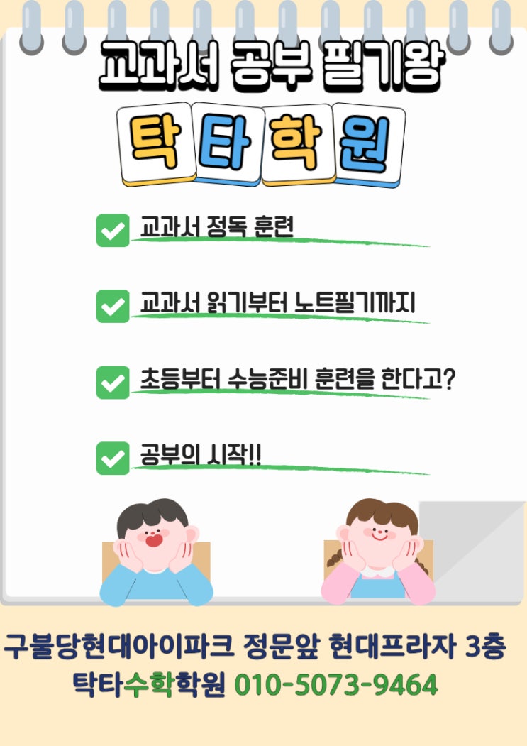 안녕세요. 천안 구불당 현대아이파크 정문 앞에 위치한 탁타수학학원입니다. 저희 탁타수학학원은 단순히 수학 문제를 풀고 점수를 올리는 것을 넘어, 초등 3학년부터 중등 3학년까지 우리 아이들이 급변하는 미래 사회에 적응할 수 있는 '근본적인 학습 능력'을 길러주는 데 집중하고 있습니다. 특히, 국어, 사회, 과학, 국어문법, 한국사, 역사를 아우르는 핵심 교과 수업을 공필왕(공부 정독 필기왕) 프로그램으로 진행하는 이유가 바로 여기에 있습니다. 정보의 바다에서 길을 잃지 않고, 인공지능이 대체할 수 없는 인간 고유의 경쟁력을 키우는 교육. 왜 지금, 구불당의 학부모님들께서 공필왕에 주목해야 하는지 그 필연적인 이....... <img src="https://blogthumb.pstatic.net/MjAyNTExMjdfMjQ3/MDAxNzY0MjIyNTk2NjAy.gkazB8GpK5Ut_-5Ar-huRU8ZpGnTIF-ONAUN72JbnWAg.gT480Pt4wZHRfAdcO9kftstcJDrgfZ3MMaVKtR2lYBsg.JPEG/%C1%A6%B8%F1%C0%BB_%C0%D4%B7%C2%C7%D8%C1%D6%BC%BC%BF%E4_-001.jpg?type=s3" />