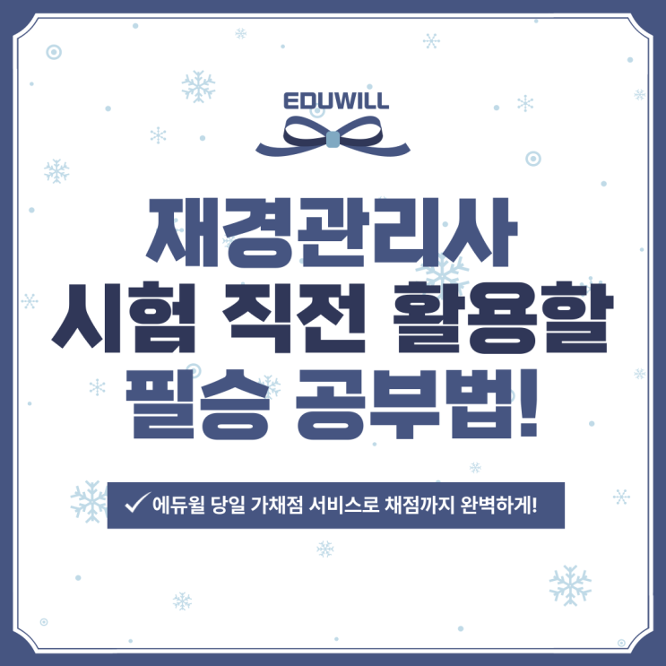 안녕하세요, 에듀윌입니다! 올해 마지막 회계 관리 자격시험 원서 접수가 지난 2일부터 시작되었는데요, 많은 수험생분들이 합격을 향한 마지막 스퍼트를 내고 계실 것으로 예상됩니다! 그래서 오늘은 재경관리사 시험 막바지에 꼭 활용해야 할 필승 학습법을 소개해 드리려고 합니다! 이에 더해, 시험이 끝나자마자 내 점수를 빠르게 확인할 수 있는 에듀윌 가답안 서비스 사전예약도 함께 안내해 드리니 놓치지 말고 꼭 확인해 보세요! [목차] - 기출문제부터 실전 모의고사까지 완전 정복! - 과목별 학습 필승법 - 비전공자 필수! 무료 교재 추천 [ 기출문제부터 실전 모의고사까지 완전 정복! ] <기출문제> 기출문제 학습, 왜 중요할까....... <img src="https://blogthumb.pstatic.net/MjAyNTEyMDVfMTEw/MDAxNzY0ODk2MzI4NTYx.16sGyfyyHaocqJfWset3c6W1G7eJPadVC7R6jG4Ru6Ug.2kf_zQHyMED3I7DGFcmZ-mY2qrYuRrASiU2SLlFJBqsg.PNG/001.png?type=s3" />