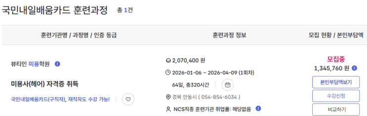안녕하세요 안동 뷰티인미용학원에서 미용사(헤어)자격증 국비반 모집중입니다 기간은 2026-01-06 ~ 2026-04-09 64일, 총 320시간 대략 3달과정입니다 (기간은 변동될수있음!) 5명 모집중이니 관심있으신 훈련생분들은 문의부탁드려요 ! 문의 : 054-854-6034 고용24 훈련검색 링크 https://www.work24.go.kr/hr/a/a/1100/trnnCrsInf0.do?tracseTme=1&endDate=20261209&keyword1=&keyword2=&pageSize=10&orderBy=&startDate_datepicker=2025-12-09¤tTab=1&topMenuYn=&pop=&tracseId=AIG20240000486798&keywordTrngNm=%EB%AF%B8%E....... <img src="https://blogthumb.pstatic.net/MjAyNTEyMDlfMTAg/MDAxNzY1Mjc4ODQ3ODUz.SEVnm0VTFYsSE1s3_S5l64qjbJV6G6y_ylIhFroKjPog.Tu9Qoq4QcgNZkGrbZfoQ41Jb8QX8wDlsEAHPED8JhvEg.PNG/%BD%BA%C5%A9%B8%B0%BC%A6_2025-12-09_201044.png?type=s3" />