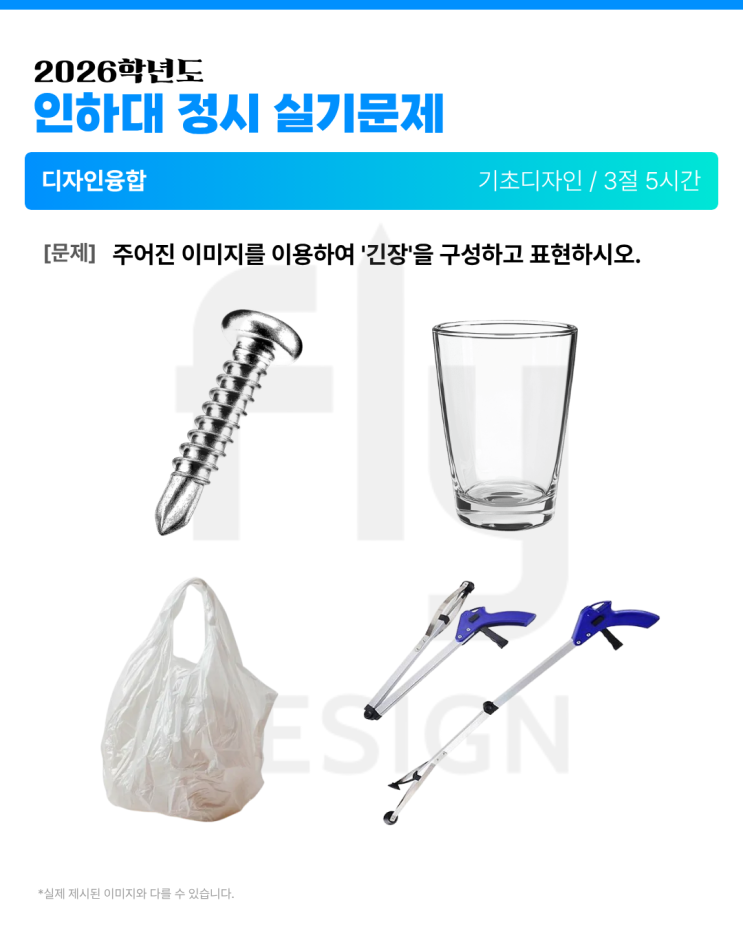 2026 인하대학교 미대 정시 기출문제 인천 플라이미술학원 안녕하세요! 인천 플라이미술학원의 루다쌤이에요~ 오늘은~ 2026학년도 인하대학교 미대 정시 기출문제를 알려드리려고 해요! 2026학년도 인하대에서 출제된 정시 기출문제와 올해 정시 경쟁률까지 알려드릴게요! 그럼 지금부터 시작하겠습니다~ 2026학년도 인하대 정시 실기 기출문제 디자인융합학과 [문제] 주어진 이미지를 이용하여 '긴장'을 구성하고 표현하시오. 2026학년도 인하대 정시 실기 기출문제 디자인테크놀로지학과 [문제] 제시물을 활용하여 화면을 자유롭게 구성하고 표현하시오. 2026학년도 인하대 정시 실기 기출문제 의류디자인학과 [문제] 제시물을 활용....... <img src="https://blogthumb.pstatic.net/MjAyNjAxMjdfMjQz/MDAxNzY5NDk5MzQ3MTI2.4UhYWV3n5phy6GwvQvrvwE8poadjGetauTQUKVGFHX4g.HMZO76ofipBI1T19ilFHHNvM-ZWDCjR6gwsOY_A6u_sg.PNG/1.png?type=s3" />
