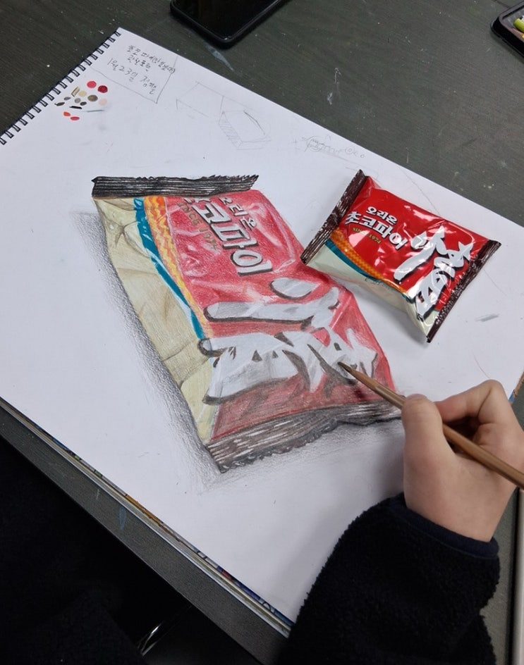 안녕하세요〰️ 젊은평미술학원 관저캠퍼스 초등반쌤입니다 ପ(。ᵔ ⩊ ᵔ。)ଓ “선생님~~ 배고파요ㅜㅜ” 학원에만 오면 다들 왜 이렇게 배가 고픈건지~ㅋㅋ 요녀석들!! 너희를 위해 과자 그리기 수업을 준비했다 과자의 형태를 관찰해보고, 입체감과 명암의 원리를 이해해보는 수업✨ 열심히 그려서 완성하면 과자를 먹을 수 있다구 우리 고학년 친구들은 비닐 재질의 초코파이를 그리는 중입니다‼️ 비닐의 질감과 반사되는 빛, 포장지의 구김 등을 자세히 관찰하고 표현해봅시다 수채화, 색연필, 소묘••• 다양한 초코파이가 완성되고 있군요 우리 1~4학년 친구들은 네모난 박스 과자 그리기! 경력과 학년에 따....... <img src="https://blogthumb.pstatic.net/MjAyNjAzMTlfMTg4/MDAxNzczOTI0NzM2NDMx.-eqt_6WJw4iga_EyKVXZXwOlGUybtJRvB1YCE0HL1YMg.yaGkIs5dWewVrM3mRR57ieijRjvxiLCn6gKA0AB0dH0g.JPEG/output%A3%DF2254425879.jpg?type=s3" />