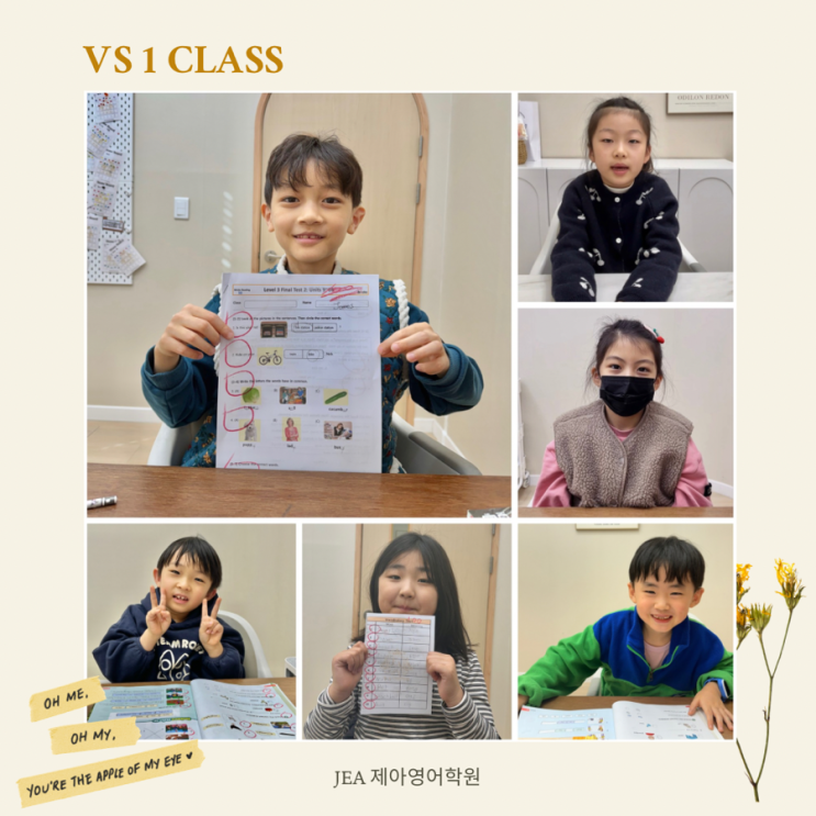 안녕하세요! 대전 관저동 1:1 프리미엄 맞춤 영어학원 JEA 제아영어학원입니다. 지난 SI 반 친구들 수업 소개에 이어 오늘은 VS 반 수업 들을 소개해 드리려고 해요. 지난번 포스팅은 아래 링크에서 확인 가능합니다. VS 반은 총 5단계의 단계가 있는데요! 초등학생 친구들이 가장 많이 속해 있는 Level 레벨로 우리 아이들의 첫 독해의 시작이자 기초 회화 및 문법 위주의 수업으로 구성되어 있는 만큼 다양한 레벨별로 다채로운 수업을 준비하고 있어요. 그중 오늘은 VS 1 Class를 소개해 드리려고 해요! VS 1 Class는 파닉스 후 사이트 워드를 포함한 기초 독해 훈련 및 Listening & Speaking 수업을 통한 기초 회화 수업을 포함하고 있습....... <img src="https://blogthumb.pstatic.net/MjAyNjAzMjBfMTIw/MDAxNzczOTkxODM1OTU1.c1NfFtzIMYCNbDSB8Og6NfgfJ-jNstjJZHvRvbxnI-8g.Q3PKNiRTS-gowPUDXcvHL915FF29nPPIax3CbSfINH0g.PNG/Light_Yellow_Photo_Happy_Birthday_Instagram_Post%C0%C7_%BB%E7%BA%BB.png?type=s3" />