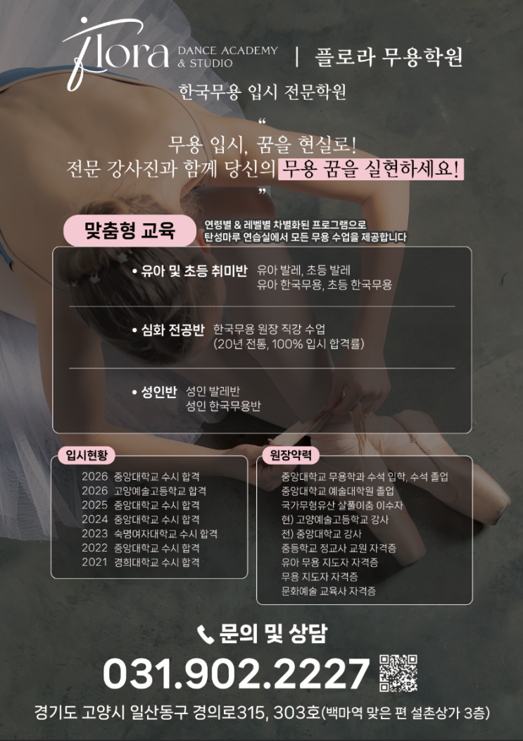 안녕하세요. 플로라무용학원입니다. 2025년에도 쉼 없이 달려온 플로라무용학원에서는 2026년도 예술고등학교와 무용과 대입에 모두 합격했어요. 내년에도 올해와 같은 성과를 낼 수 있도록 최선을 다해 지도할 것을 약속드립니다. 더불어 2026년에도 무용과 입시에 도전할 새로운 학생들을 모집합니다. 20년 전통의 플로라무용학원에서는 원장 선생님의 전문적인 티칭을 통해 각 학생의 꿈을 이루어 드리겠습니다. 입시율 100%를 자랑하는 우리 학원에서 여러분의 꿈을 현실로 만들어 보세요. 더불어 2025학년도에는 취미반부터 심화 전공반까지 다양한 학생들이 군무 및 개인무 콩쿠르에 참여하여 많은 상을 수상하는 영광을 안았습니다. 2026학....... <img src="https://blogthumb.pstatic.net/MjAyNTExMThfMjMx/MDAxNzYzNDQ2MDc4OTg2.rlljOrIAgZP68vxdSCmxycZMUAGmRGauxmWxSU3GkZcg.BBObRhYhkB3Fyk1ELnOI6X9UtZrUkZn_UAAJhgTm65wg.PNG/%B9%AB%BF%EB%C7%D0%BF%F8%C0%CF%BB%EA.png?type=s3" />