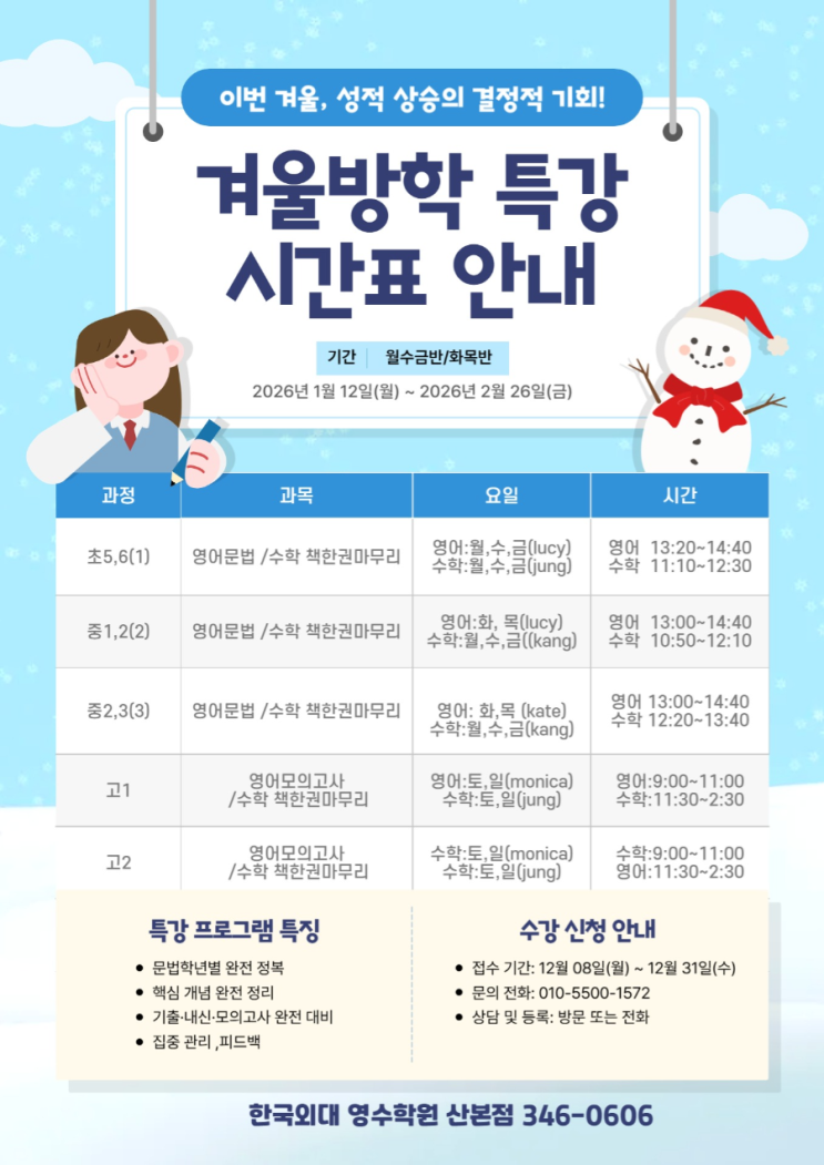 (산본 한국외대 영수학원)겨울방학 영어 수학 특강 안내