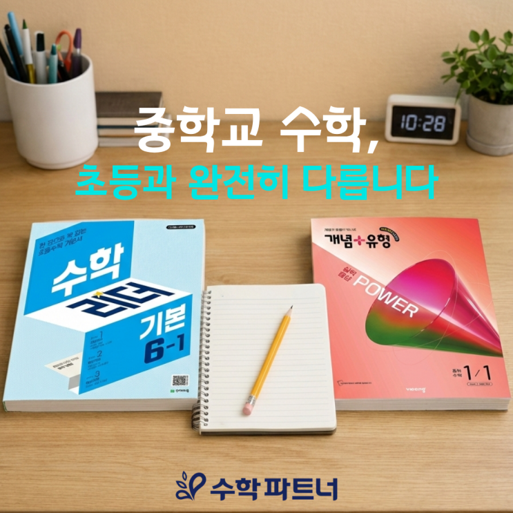 안녕하세요! 수학파트너입니다. 중학교 수학은 초등 수확과는 완전히 다릅니다. “초등학교 때는 잘했는데요.” “연산도 빠르고, 문제도 곧잘 풀었어요.” 중학교에 올라온 뒤 성적이 흔들리는 아이들 상담을 하다 보면 거의 빠지지 않고 나오는 이야기입니다. 그런데 이 말 속에는 한 가지 중요한 오해가 숨어 있어요. 중학교 수학은 초등 수학의 ‘연장’이 아니라, 완전히 다른 과목이라는 점입니다. 1️⃣ 계산 중심에서 ‘개념 중심’으로 바뀝니다 초등 수학은 계산 정확도 반복 연습 풀이 과정이 단순한 문제 들이 중심이었습니다. 하지만 중학교 수학은 다릅니다. 왜 그런지 설명해야 하고 개념을 이해하고 적용해야 하며 문제 안에 여....... <img src="https://blogthumb.pstatic.net/MjAyNjAxMjJfNjgg/MDAxNzY5MDcxMjUyNzYz.j9HEcRBB-Le_Gr8cGJq_jAO-F_H9LuTaBJ8hcNEz7Hcg.VLnAzr6xMgPS__AXBDM7F4-lN09TM8GymzmsEd8_dcQg.PNG/%C1%A6%B8%F1%C0%BB_%C0%D4%B7%C2%C7%D8%C1%D6%BC%BC%BF%E4._%2818%29.png?type=s3" />