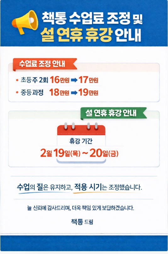 [책통 수업료 조정 및 설 연휴 휴강 안내] 안녕하세요, 책통입니다. 교육 전반의 공통적인 수업료 인상 결정으로 1월부터 적용되는 상황이나, 책통은 학부모님 부담을 고려해 2월부터 적용합니다. 초등 주 2회: 16만원 → 17만원 중등 과정: 18만원 → 19만원 또한 **설 연휴로 인해 아래 기간은 휴강(방학)**입니다. 휴강 기간: 2월 19일(목) ~ 20일(금) 수업의 질은 유지하고, 적용 시기는 조정했습니다. 항상 신뢰에 감사드리며, 더 책임 있는 수업으로 보답하겠습니다. (부족한 회차는 보강진행합니다) — 책통 드림 <img src="https://blogthumb.pstatic.net/MjAyNjAxMjhfMTQx/MDAxNzY5NTYzNDg5Nzg3.daRoE8Emie_L7JvH1fMgGbcbfXDHJnvJIq7uxy_fM9Ug.p8Fs3ASoDHA9GCNlByeKFlVr5GxC39oNyp78PGe0tbIg.JPEG/1769563060552.jpg?type=s3" />