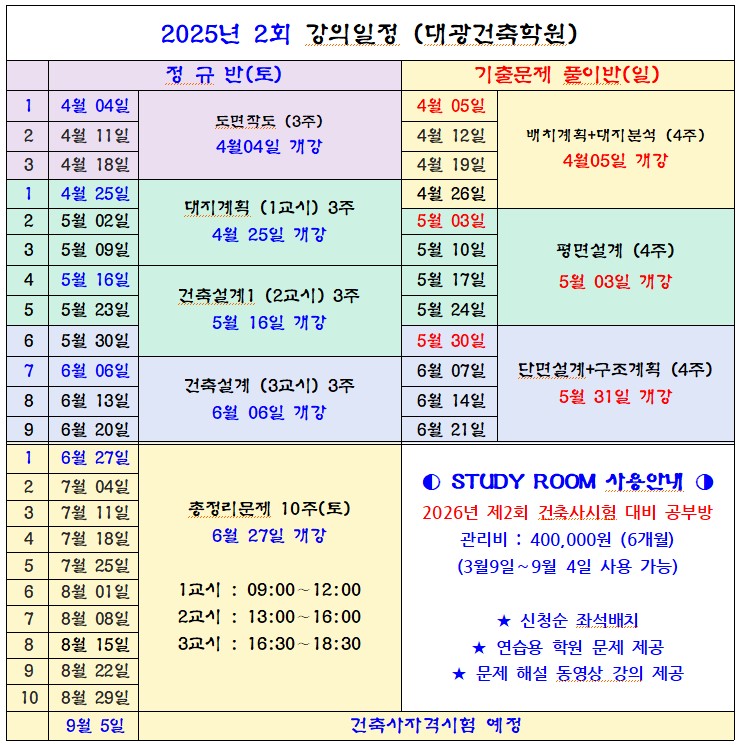 ◐ 2026년 2회 건축사자격시험 강의 ◑ 광주 건축사학원 / 대광건축학원 상담 접수중 : 010-3641-3651 ◐ 2026년 2회 건축사시험 대비 정규반(토) ◑ 도면작도(3주)+정규이론(9주)+총정리문제(10주) ☞ 개강일 4월 04일 10:00∼ 담당 교수 : 김연수 교수님 건축사 / 시공기술사 ◐ 2026년 2회 건축사시험 대비 과년도문제 풀이반 (일) ◑ 배치+분석(4주)+평면설계계(4주)+단면+구조(4주) ☞ 개강일 4월 05일 10:00∼ ◐ 2026년1회 건축사시험 사전 등록 혜택 ◑ 1) 정규이론 동영상강의 제공 2) 신청순 좌석 배치(시험시 까지 지정석) 3) 사물함 무료 대여 4) 학원 제도판 무료 사용 ◐ 건축사자격시험 개편 방향 ◑ 1) ’27년부터 예비시험 합격....... <img src="https://blogthumb.pstatic.net/MjAyNjAzMDVfMTkw/MDAxNzcyNzAxNjA3NTA3.PF_l3aTivvnd33jQTSaqT0lo6bQN5RqgQsnkakCYLvkg.KncLPG--6q1uxQsm_OSca3ncFbBW5t0CXMpG6ijj16Ag.JPEG/05_26-2_%B0%AD%C0%C7%C0%CF%C1%A4%28%B4%EB%B1%A4%29.jpg?type=s3" />