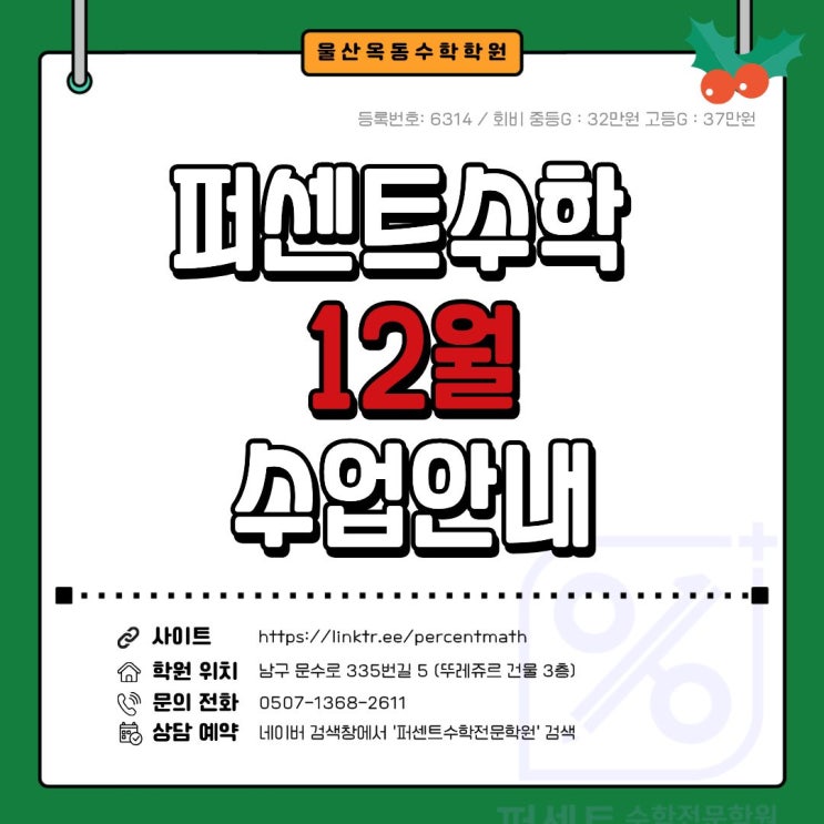 [울산옥동수학학원] 퍼센트 수학 2025년 12월 (방학전) 수업 안내