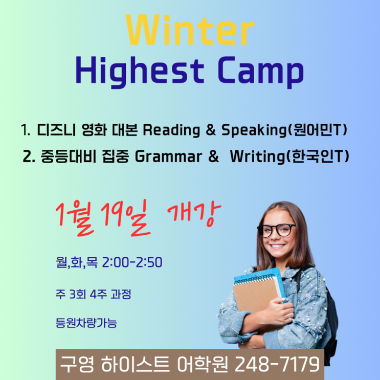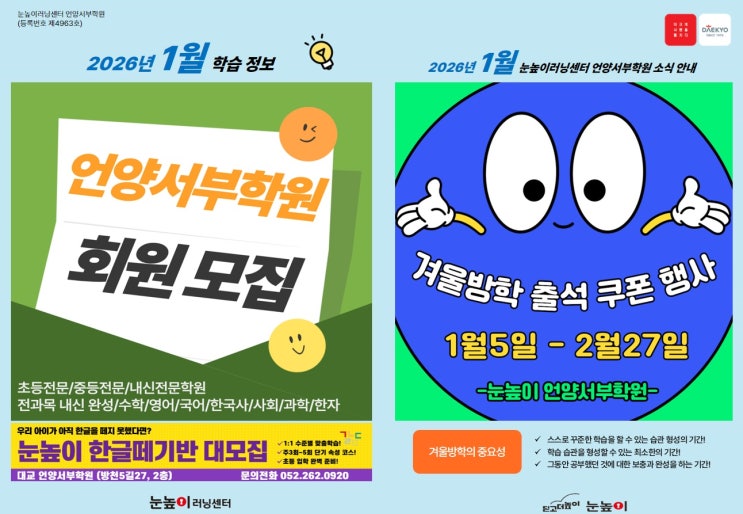 어느덧 다가온 겨울방학 이번학기의 부족한 점을 채우고 다음학기를 여유롭게 준비 할수 있는 아주 중요한기회 ! 우리 학생들이 소중한 시간을 더욱 알차게 보낼 수 있도록 스피킹, 라이팅, 그리고 그래머 실력을 탄탄하게 다질 수 있는 특별한 특강을 준비했습니다! 이번 특강은 6명이상 모집시 진행됩니다. 부족했던 부분을 집중적으로 채우고, 다음 레벨을 위한 강력한 영어 기초를 다질 절호의 기회가 될 거예요! 특강 내용 - 기간: [1월 19일] ~ [2월12일] 월, 화, 목 주3회 (총 4주 / 12회차 진행) - 과목: 스피킹&리딩(1-4학년 우선) 라이팅&그래머 (5-6학년 우선) - 신청 기간: [1월6일] ~ [1월12일] - 문의: 248-7179,....... <img src="https://blogthumb.pstatic.net/MjAyNjAxMDZfOTEg/MDAxNzY3NjgxODQyNzk3.5xZZKVom6tzHAjH3w2H2-rG85nUYe-LtFb8jtdVEIFsg.88FE10tc0rlWkn0nIZiJ2_EfIeRGwDrWAoDE0UbAzCQg.PNG/%B3%EC%BB%F6_%C7%D0%BF%F8_%B9%E6%C7%D0_%C8%AB%BA%B8_%C0%FC%B4%DC%C1%F6_%A3%A8%C0%CE%BD%BA%C5%B8%B1%D7%B7%A5_%B0%D4%BD%C3%B9%B0%A3%A9_%A3%AD_1.png?type=s3" />
