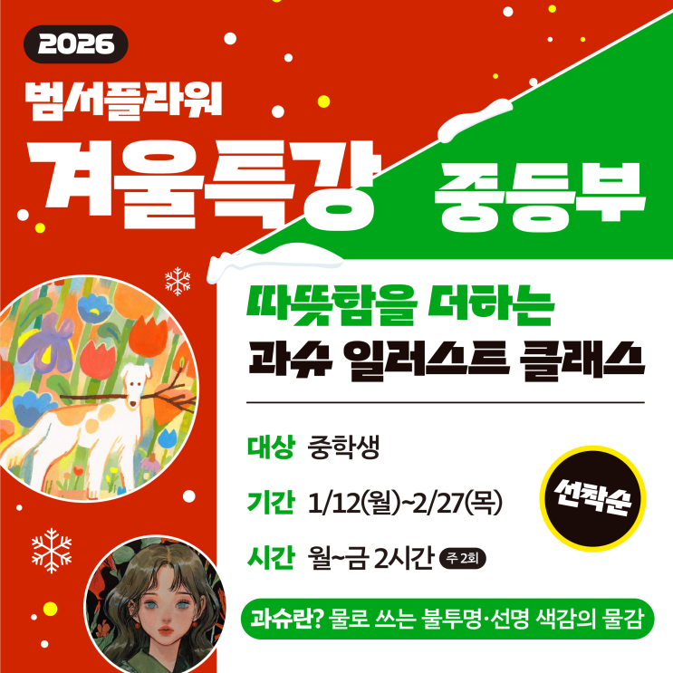 안녕하세요~ 겨울방학을 맞이하여 중등부에서 과슈로 다양한 그림을 표현하는 특강수업을 준비하였습니다. 과슈라는 불투명수채화 표현기법을 경험해 볼 수 있는 기회라 생각되니 많은 관심 부탁드립니다~~^^ * 범서플라워미술학원* <img src="https://blogthumb.pstatic.net/MjAyNjAxMDZfMjgy/MDAxNzY3Njc5MTA5NTI2.iy_nrkFZhxHR9Kj2RSUXzzJ_-naMuMGnZSuJqmCgOxYg.lCx-y2WaA3fNCMeHksUfxSu1urKlt2v1HTDTBIwXe3og.PNG/KakaoTalk_20251204_150838391_01.png?type=s3" />