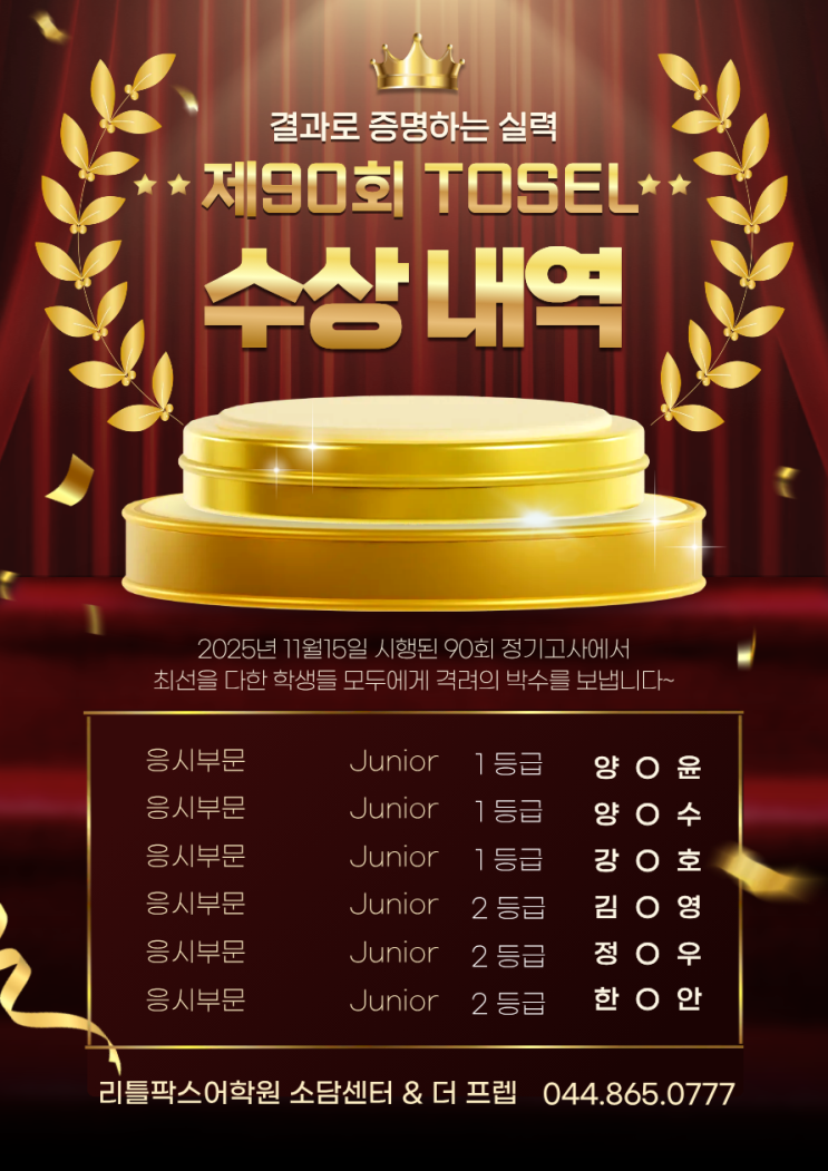 안녕하세요! 리틀팍스어학원 & 더프렙 소담센터입니다. 지난 11월 15일 시행된 제90회 토셀(TOSEL)정기 시험에서 우리 소담센터의 재원생들은 의미있는 결과를 확인 하였습니다. 물론, 결과도 중요하지만, 그보다 더 값진것은 우리 아이들이 시험 준비부터 포기하지 않고 완주했다는 사실입니다. 이번 토셀정기시험을 통해 객관적인 실력을 시험으로 확인해보는 경험 내가 어느정도인지 또 부족한 부분은 어떤 영역인지 점검해 보는 시간을 가져다는 점에서 우리 모두에게 큰 의미가 있었습니다. 수고 많았고 도전하는 우리아이들 정말 자랑 스럽습니다! * 응시생들은 학년대비 높은 단계의 시험을 응시하였고 좋은 결과를 확인 하였습니다. ....... <img src="https://blogthumb.pstatic.net/MjAyNTEyMTZfMjYw/MDAxNzY1ODY3Njg0Njgz.24sbnnZJhpVyfZc1yNy3D6t_W8xln8kqQIqdIyySI_kg.H8OBTLSgmT3N8GYtVWzeEGd8ELooZfr5mdn6xEpNerAg.PNG/2.png?type=s3" />