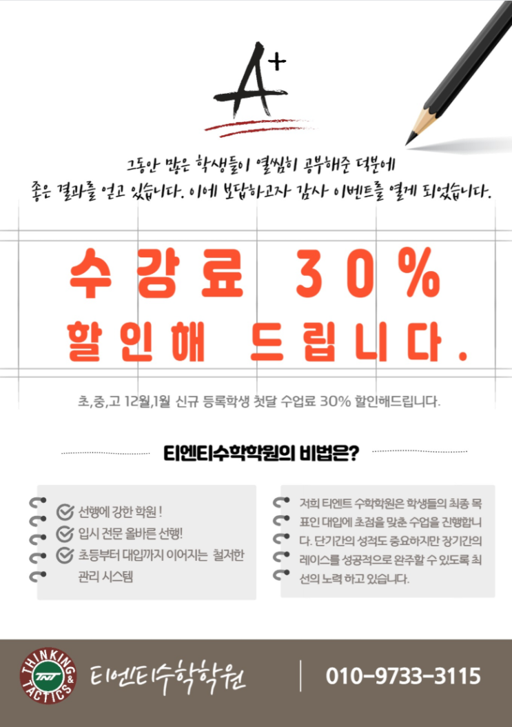 그동안 저희를 믿고, 소중한 자녀분들 맡겨 주신 학부님들과, 잘 따라와준 학생들 덕분에 좋은 결과를 얻고 있습니다. 이에 조금이나마 보답하는 뜻에서 할인 이벤트를 하게 되었습니다. 언제나 최선을 다하는 티엔티가 되겠습니다. 감사합니다! <img src="https://blogthumb.pstatic.net/MjAyNTEyMTdfMTIz/MDAxNzY1OTQxNjg4NTM4.RMUnH4nGfX2hvPXzoqczuzt5QrOEpGJOEaFFoxO8FQIg.lE8yrgnylML9ptpAUeYb6OYddyuQt5yoCSBXq_fhRE8g.PNG/%BD%C5%B1%D4.png?type=s3" />