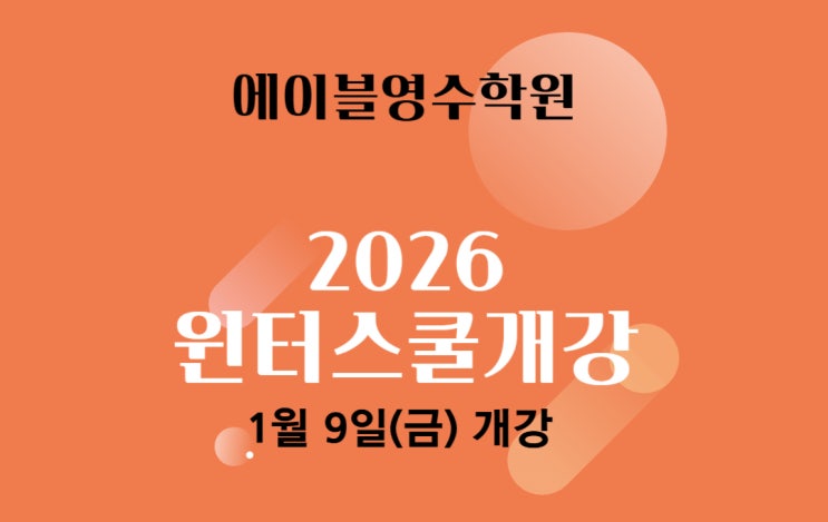 안녕하세요. 에이블 영수학원입니다. 2026 윈터스쿨 개강은 1월 9일 입니다. 이번 겨울시즌도 알차게 교육 프로그램을 준비 했으니 본인이 필요한 역량을 확장할 수 있는 시간을 필히 가졌으면 좋겠습니다. " 꾸준함이 모든것을 이긴다 " 저희 학원의 모토처럼, 본인의 부족한 실력을 이번 겨울 방학동안 충만하게 채울 수 있도록 노력합시다. 정규 수업 시간표 ※ 상기 수업 시간표는 학원 내부 혹은 기타 사정에 따라 시간 조정 될 수 있으니 참조하시기 바랍니다. ※ 윈터스쿨은 예비고1, 2 학년만 신청자에 한하여 실시합니다. 윈터스쿨 미신청자는 기존과 동일하게 정규 2회 수업 , 1회 체킹 실시합니다. 2. 윈터스쿨 시간표 3. 단....... <img src="https://blogthumb.pstatic.net/MjAyNTEyMjBfNTAg/MDAxNzY2MjEwMzYzMDA1.2S8q3E-WpJLojZasXMBpbZjMk-_1KlJubBw4kW6ZBkcg.mLz3feuBaX17CgqiVDBDffUSS4B25pwLhfLU7DOSddgg.JPEG/%C0%A9%C5%CD%BD%BA%C4%F0-001.jpg?type=s3" />