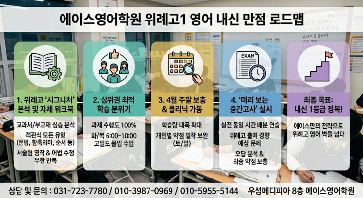 [위례고1 영어] 완벽한 내신 1등급을 위한 에이스영어학원의 ‘시그니처’ 대비 전략 안녕하세요, 에이스영어학원입니다. 어느덧 1학기 중간고사가 눈앞으로 다가왔습니다. 특히 고등학교 입학 후 치르는 첫 시험인 만큼, 위례고 1학년 학생들과 학부모님들의 긴장감과 기대가 남다르실 텐데요. 현재 에이스영어학원에서는 위례고1 영어 내신 만점을 목표로, 학교별 특성에 맞춘 고밀도 학습을 진행하고 있습니다. 우리 학생들의 뜨거운 학습 열기가 가득한 강의실 현황과 구체적인 대비 전략을 공유합니다. 1. 위례고 ‘시그니처’ 유형 완벽 분석 및 자체 워크북 학습 위례고 영어 시험은 단순히 지문을 암기하는 것만으로는 부족합니다. 에이....... <img src="https://blogthumb.pstatic.net/MjAyNjA0MDJfMTc1/MDAxNzc1MTE4NzQ1MTI0.CSNLZSV1Lh6lZVaRj4Iba3871rguznxS8B32UIopmZEg.qIiXK7-QIL78sMjB9jiGRJtkSl-BsPtrAfSNwopOGuQg.PNG/image.png?type=s3" />