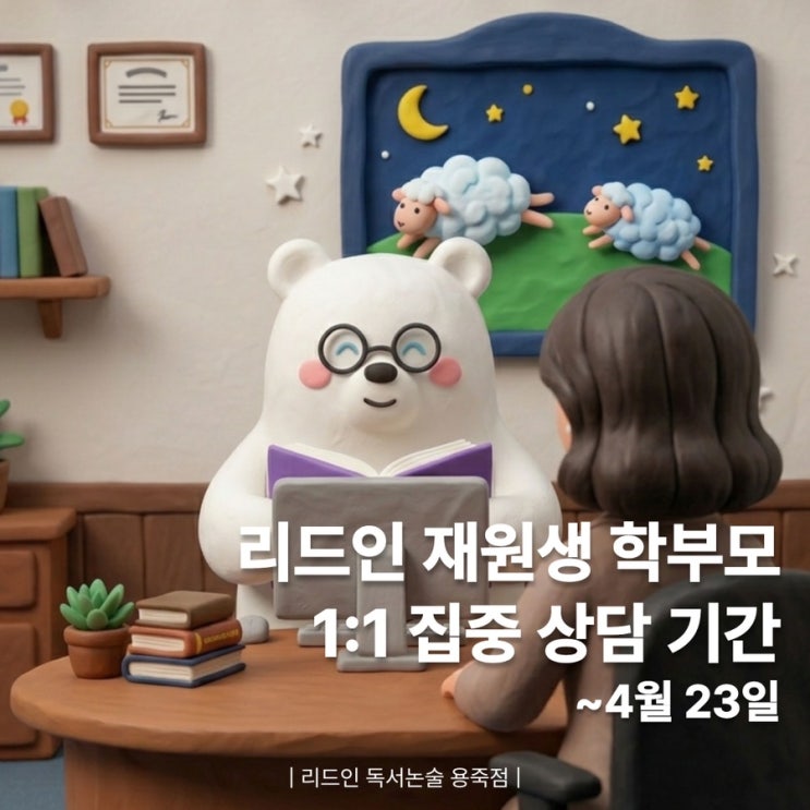 안녕하세요. 용죽지구 독서논술 학원, 리드인 입니다. 어느덧 4월, 새 학기가 본격적으로 시작되었습니다. 리드인을 다니며 실력을 쌓고 있는 우리 재원생 친구들. 매 수업마다 독서 이해도 진단과 독서 노트, 첨삭 피드백을 학부모님께 전달드리고 있습니다. 하지만 3월과 4월은 조금 다른 시기입니다. 학년이 바뀌며 학습 난이도, 학교생활, 친구 관계 아이들은 눈에 보이지 않는 큰 변화를 겪고 있습니다. 그렇기에 학부모님께서 더욱 고민과 걱정이 많으실 겁니다. 우리 아이, 지금 잘하고 있는 걸까요? 그래서 저희 용죽 리드인에서는 3월 23일부터 4월 23일까지 한 달간 1:1 재원생 학부모 집중 상담 기간을 운영합니다. 4월에 재원생 학부....... <img src="https://blogthumb.pstatic.net/MjAyNjA0MDJfMjA3/MDAxNzc1MTIyODY0MDQx.JXOkPMW1Wl5dCoCjEk0NYO8hcDatDlGMfugZzG_48VAg.9dGpWmDHllBGAT1ix1YvvDZc1a9ajbSZycBd2Jv8cGcg.JPEG/%BF%EB%C1%D7%C3%CA%A3%DF%B5%B6%BC%AD%C7%D0%BF%F8%A3%DF%B8%AE%B5%E5%C0%CE%A3%DF%B5%B6%BC%AD%B3%ED%BC%FA%A3%A81%A3%A9.jpg?type=s3" />