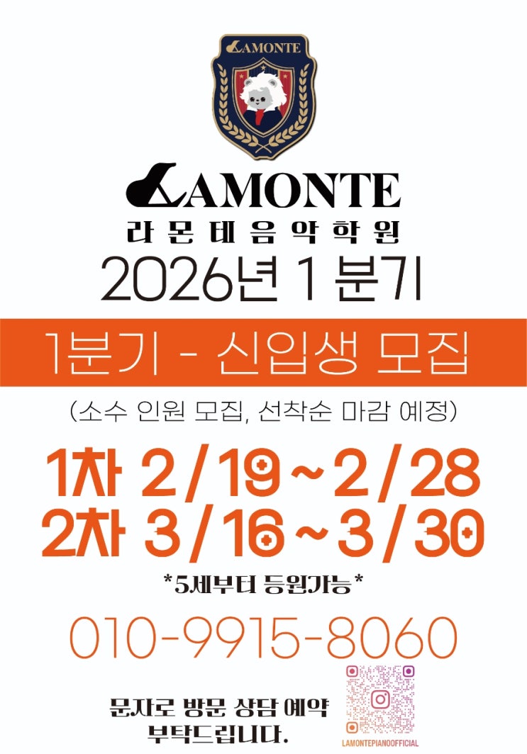 재원생 형제.자매 입학은 우선입니다 피아니스트의 주법을 먼저배우는 특별한 커리큘럼 믿고 보내시는 만큼 인풋 아웃풋이 확실한 연주중심 피아노학원 입니다 100명 이상의 모든친구들은 송지혜 박사의 피어노선물과 아이콘피아노로 특별한 수업을 받고 있어요 1분기 소수모집후 대기는 받지 못하는점 이해해주세요 5세부터 등원 가능한 특별한 교재와 수업 방식으로 즐겁게 제대로 피아노를 시작합니다 예중반 전공반까지 재대로 갖춘 커리큘럼 라몬테음악학원 입니다 1분기 소수모집은 기한내에 마감하고 있습니다 문자 예약후 상담일정 잡아주세요 강사선생님들과 원장님의 소통으로 아웃풋이 확실한 라몬테음악학원의 수업 매달 특강수업과....... <img src="https://blogthumb.pstatic.net/MjAyNjAyMTZfMjM2/MDAxNzcxMjI3NjM1OTI3._zFj5KgWfXIFkTWtwg94Oh_ZapiVPqZ_7sLxO_83Rcgg.erbQ6WSgBTgDk1AvRYh2bIxqEEDhdNT7JXuB7f0sp1og.JPEG/900%A3%DF1771225509927.jpg?type=s3" />