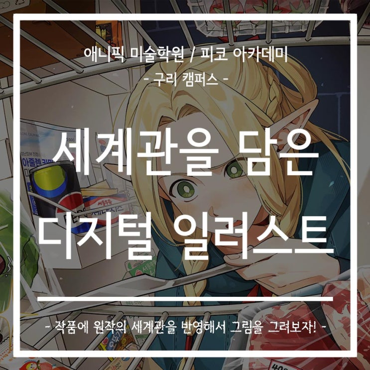 안녕하세요! 구리 다산 미술학원 / 별내 마석 만화 학원 애니픽 미술학원 피코 아카데미입니다~ 어느덧 2월이 왔습니다. 새해 목표는 다들 잘 지키고 계시나요? 아직도 디지털 그림을 시작할지 말지 고민이 되시나요?? 망설임은 시작만 늦출 뿐입니다:) 오늘 소개할 작품은 <세계관을 담은 디지털 일러스트>입니다. 소개하기에 앞서, <던전밥>이라는 작품을 알고 계신가요? 흥미로운 세계관으로 화제가 되었던 작품인데요~ 많은 화제성으로 애니메이션으로도 제작되기도 했답니다! <던전밥 줄거리> 던전에 들어간 주인공 일행! 하지만 식량과 장비가 전멸하는데..! 이를 구할 돈이 없다? 그러면 던전 안의 마물로 요리를 하고....... <img src="https://blogthumb.pstatic.net/MjAyNjAyMDRfNDYg/MDAxNzcwMTgwNjg5NDM4.RmHOuhn7xto84ONYKq2A5MLMndU3vHXZlbwKJAaCSd8g.BnphZHvWDR5UhNwp50ZL97ZIJtyUGhVv_kRjRcYddQcg.JPEG/0204_%B4%EB%C7%A5%C0%CC%B9%CC%C1%F6.jpg?type=s3" />