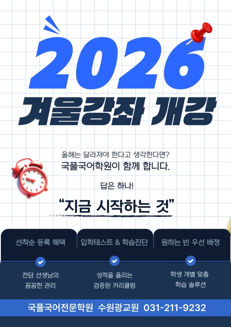 제목: 광교국어학원 국풀최용훈국어 2026 예비고1 겨울강좌 개강 안내 * 예비고1 개강 일시 : 2025. 12. 6. 토 * 예비중1~예비고3 (전체개강) : 12. 27.토 국풀국어학원 입학을 위한 테스트는 아래 링크를 통해서 신청 바랍니다. 입학테스트 신청하기(url클릭) : https://gwanggyo.gukpul.com/new_prog/entrance.aspx?menu_idx=6251 "고등 국어를 아는 학원, 성적을 만드는 학원, 국풀국어학원입니다. 예비고1을 위한 맞춤형 정예 커리큘럼으로 시작하세요!' "수능형 독해+내신형 분석. 예비고1을 위한 고품질 국어 수업을 제공합니다!" 국풀국어 최용훈국어학원은 중등부 및 고등부 전 학년 대상의 특화된 학습과정을....... <img src="https://blogthumb.pstatic.net/MjAyNTExMDVfMjYy/MDAxNzYyMzM2NjE0Nzk0.xAGTP_2cvYc0ysCvm28I2Yq-rv9k00hmPMSO1qY7ODkg.99ORZkrNMx4L5F2dArrEKkCWV_an9ZQWAF4WSIrkIYQg.JPEG/%C0%FC%B1%B3-001_%287%29.jpg?type=s3" />
