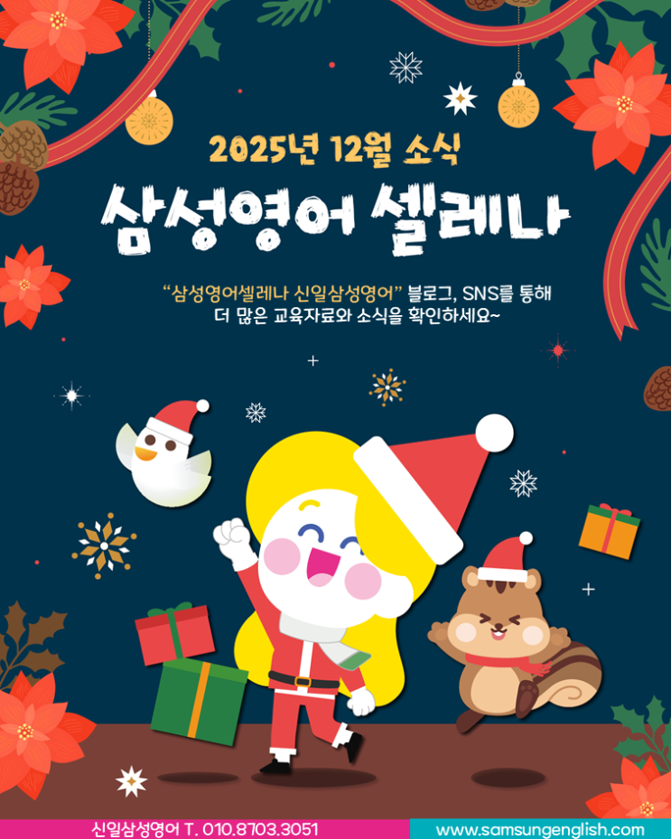 안녕하세요. 신봉동 초등중등 영어 전문학원 삼성영어셀레나 신일삼성영어 라라원장입니다. 12월 학사일정 안내해드립니다. 11월 수업 종강은 12월 1일이며, 12월 수업 개강은 12월 2일 종강은 12월 30일 총 20회차 수업입니다. 12월 부터 아이들이 한학년 진급 한 커리큘럼으로 진행됩니다. 현 초등 6학년은 중등부 커리큘럼으로 전환되오니, 개별로 보내드리는 안내문 참고 부탁드립니다. 학부모님을 모시고 2025년 개별 간담회가 잘 마무리 되었습니다. 매년 누적된 학습 성취도를 수치화 하여, 간담회 때 객관적으로 우리 아이들의 성과를 보여드리고, 최적화된 학습 로드맵을 제시하는 가장 의미 있는 상담 시간으로 발전시키겠습니다. 단어....... <img src="https://blogthumb.pstatic.net/MjAyNTExMjNfMzkg/MDAxNzYzOTAxMTkyNjc4.hTAofLHdS9x0s5dxisoe3vmJXZ_E-PNe-oZ1sBjiRUsg.AZJbSzM96uvBysmLLhyZ11FxLj1cAGvW7ixw-jyCngMg.PNG/%BD%BD%B6%F3%C0%CC%B5%E51.PNG?type=s3" />