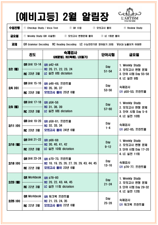 예비고등반 2월 알림장