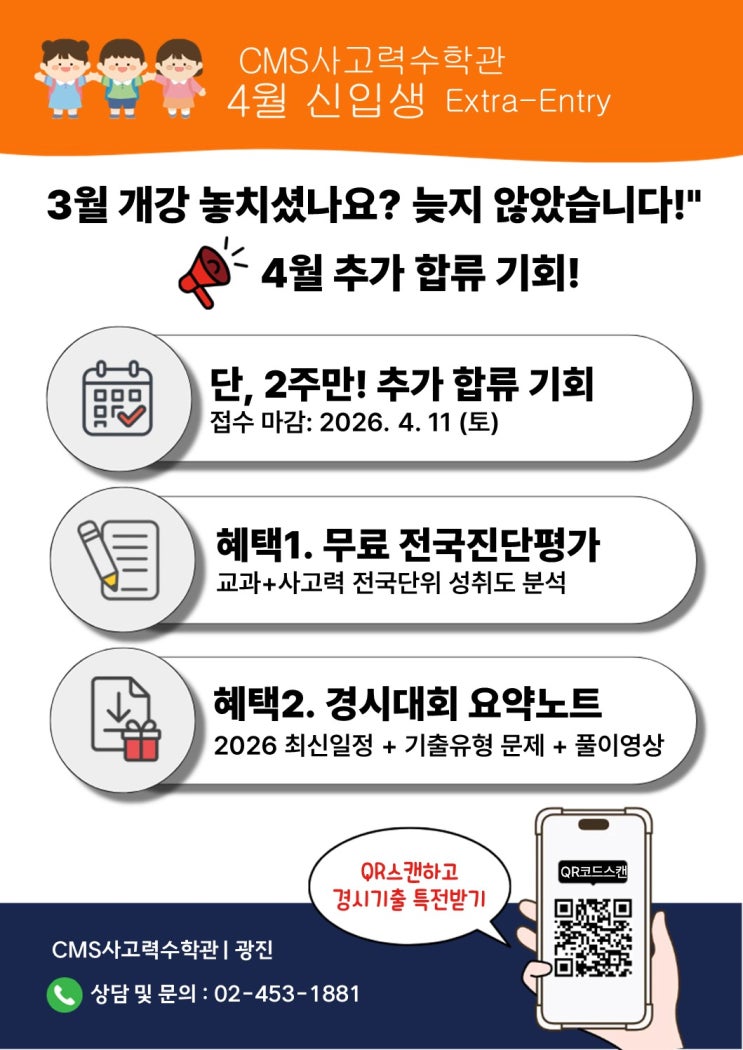 안녕하세요 CMS 사고력수학관 | 광진 입니다. 3월 개강을 놓치셨다면 4월 추가 합류 가능 하오니 많은 문의 부탁 드립니다. 대상: 7세~초5 입학 테스트 기간: ~4월 11(토) 까지 입학 테스트 비용: 무료 ★입학테스트 예약하기 클릭★ 하단 안내문 QR코드 스캔도 가능!! ★입학테스트 예약하기 클릭★ 안내문 QR코드 스캔도 가능!! 전화 문의 02-453-1881 크레버스 영재교육센터 광진 제1지점 학원 등록 번호 1896호 수강료 확인하기 클릭 #크레버스, #CMS, #CMS사고력수학, #CMS사고력관, #CMS영재교육센터, #사고력수학, #초등수학학원, #영재교육원, #초등수학, #초등수학학원추천, #교과수학, #아이러닝, #ilearning, #광진초등수학 #광진수학....... <img src="https://blogthumb.pstatic.net/MjAyNjAzMThfMTIy/MDAxNzczODMxNjE5ODMx.k9oGXNAv7JgE7RnqG2wIra0uWV7YJ_c4Xmdb7uuLp-wg.EJANbM1vaAdK7It-e5ADK3KOlbX6uHciAW92xvgMgS8g.JPEG/26%27%BA%BD_2%C2%F7%B0%B3%B0%AD%BE%C8%B3%BB%B9%AE_%281%29.jpg?type=s3" />