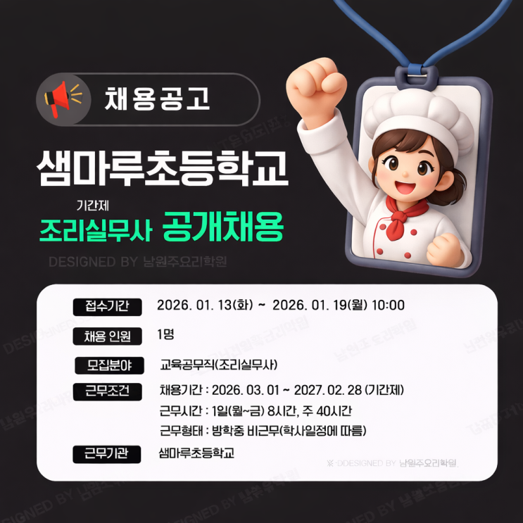[채용공고] 샘마루초등학교 조리실무사 (기간제) 샘마루초등학교 공고 제2026-1호 조리실무사 (기간제) 채용 공고 샘마루초등학교에서 근무할 조리실무사(기간제) 채용을 아래와 같이 공고합니다. 2026. 1. 13. 샘마루초등학교장 1. 직종 및 모집인원 2. 응시자격 가. 응시연령: 만 18세이상 (면접 시 업무수행 가능 여부에 대한 적격 심사 후 채용) 나. 응시자격 1) 「강원특별자치도교육감 소속 교육공무직의 임용 등에 관한 조례 시행규칙」 제8조와 제19조의 규정에 의한 임용결격 사유에 해당되지 아니한 자 2) 「식품위생법」 제40조 및 같은 법 시행규칙 제49조 내지 제50조의 규정에 의한 건강진단 결과 이상이 없는 자 3) 공고일 현재 주....... <img src="https://blogthumb.pstatic.net/MjAyNjAxMTZfMTk3/MDAxNzY4NTc0ODc0MTY2.KaaJpyYOA1NT4NaucUIH4hN2JTDMMGEiSafrXBxgFeEg.BZv4nWCcJPqV4KCJLM4tHjQiyYKhvIu2YfTlY22TUlEg.PNG/-%BB%F9%B8%B6%B7%E7%C3%CA%B5%EE%C7%D0%B1%B3%C3%A4%BF%EB%B0%F8%B0%ED_20260116.png?type=s3" />