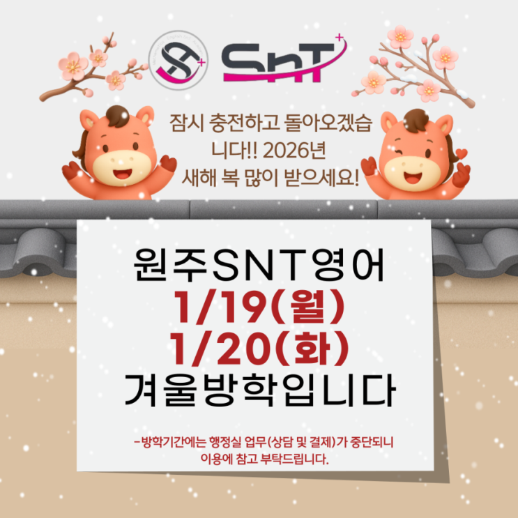 ❤️원주SNT영어❤️ 1/19(월) 1/20(화) 겨울방학입니다❄️