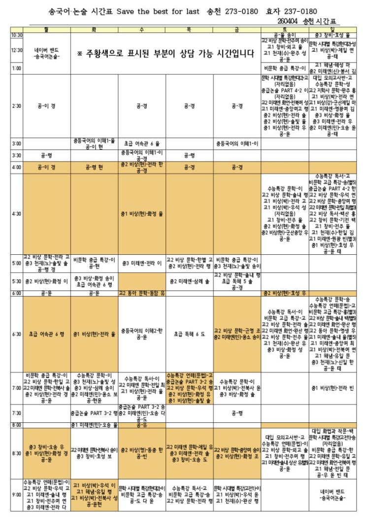 벚꽃의 꽃말은 중간고사죠. 4월엔 1차고사가 있습니다. 특강반에서도 질문 받아주고 있고 내신 반은 부교재와 기존 진도 복습 그리고 문제풀이 피드백으로 바쁜 시기입니다. 고3은 시험 범위도 많은 학교들이 꽤 있는데 미리 해놓았다면 바로 문풀 들어갈 수 있으니 지금이라도 빠진 강의 몰아 들으시면 좋겠습니다. 저도 많은 선생님들도 겨울부터 거의 쉬는 날이 없다시피 바쁜데... 뭐 바쁜게 좋은거라 생각하면서 해야겠죠. 요즘 자주 되뇌는 말입니다. 덕이 오리다. 파이팅입니다. 송천 시간표 효자 시간표 <img src="https://blogthumb.pstatic.net/MjAyNjA0MDNfMjM5/MDAxNzc1MjAwMjM4NzA1.lskYWEbcWLACMRx-JitSkbNlKDPtF-2BQrJB_SMD_rAg.8MQAG27HRYn87dvY1YiRfoS1o1fiLH81HU7fGDxugRQg.JPEG/900%A3%DF_%A1%DC%BD%C3%B0%A3%C7%A5_%BC%DB%C3%B5%B5%BF_2026_0404001.jpg?type=s3" />