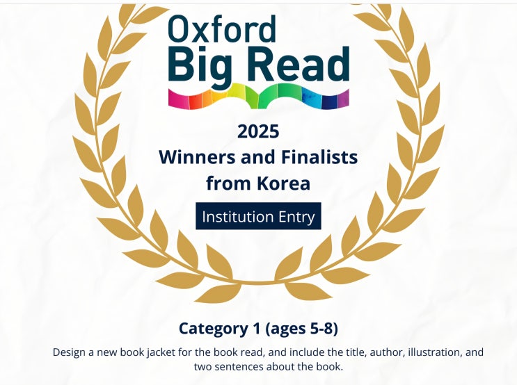 영어를 읽고, 이해하고, 자기 생각으로 표현하는 힘. 그 결과가 이렇게 멋진 성과로 돌아왔습니다. 2025년 Oxford Big Read 공모전에서 에반무어 영어학원 김*현 학생이 ‘Institution Entry’ 부문 파이널리스트로 선정되었습니다. 대회 결과 안내 대회명: Oxford Big Read 2025 부문: Korea Category 1 (Ages 5–8) – Institution Entry 선정 결과: Finalist 작품명: Clunk in the Clouds 참가 내용: 영어 원서를 읽고 → 책의 내용을 이해한 뒤 → 자신만의 시선으로 새로운 북커버를 디자인하고 영어 문장으로 책 소개를 완성하는 프로젝트 ✏️이 성과가 더 특별한 이유 이 대회는 ✔ 단순히 그림을 잘 그리는 대회가 아닙니다 ✔ 영....... <img src="https://blogthumb.pstatic.net/MjAyNTEyMjZfMjQ5/MDAxNzY2NzI4NjEzNjI1.T-_wEeNuVBGl4ytCzT848-8FTrrtsHFGukahIWYwyL8g.2QJBVw9t-BsWk8lO8kiuVIl8eb0YihcQLUwei-8vjVAg.JPEG/KakaoTalk_20251226_145541499.jpg?type=s3" />