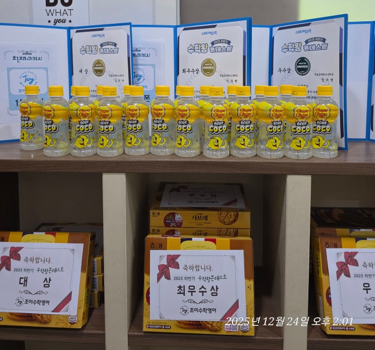 따뜻한 연말, 조이수학영어에서 열린 2025 하반기 수학왕 콘테스트가 즐겁게 마무리되었습니다. 조금은 긴장된 표정으로 시험을 보던 아이들이 결과 발표 순간에는 환하게 웃으며 안도와 위로, 시원섭섬함을 담아 서로를 축하해 주는 모습이 정말 보기 좋았습니다. 이번 콘테스트에서는 실력뿐 아니라 꾸준한 노력과 성실한 태도를 함께 살펴보며 대상, 최우수상, 우수상이 선정되었습니다. 메달을 목에 걸고 상장을 손에 들고 있는 아이들의 눈빛 속에는 그동안의 땀과 노력, 그리고 스스로에 대한 자부심이 가득했고 열심히 노력을 했지만 못내 수상의 아쉬움이 남는 친구도 물론 있었습니다. 물론, 수상한 친구들에게는 정성을 담은 선물과 함....... <img src="https://blogthumb.pstatic.net/MjAyNTEyMjZfNSAg/MDAxNzY2NzE5MzY5MDc5.BWPX8eoNlCU6f98yW75sMdSL2tvyH68uwmWBtG_pougg.itFXaEpVwjNqAZtqYf9l14V459canaEPMsS05OeToIwg.JPEG/KakaoTalk_20251226_122220144.jpg?type=s3" />