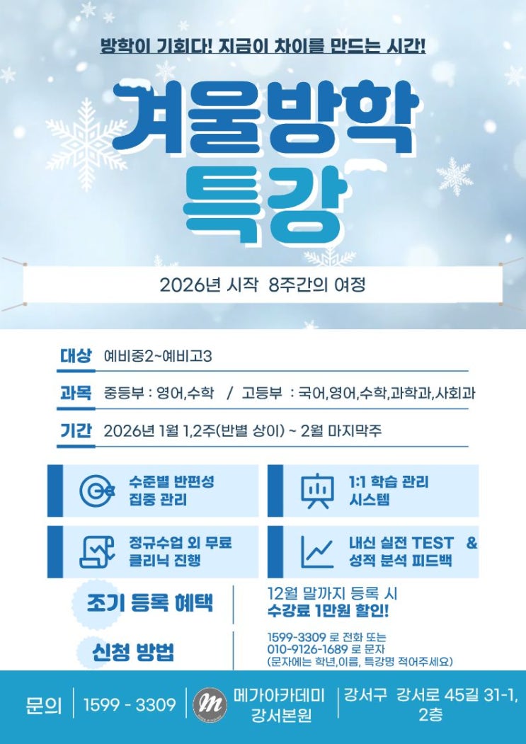 안녕하세요 메가아카아카데미 학원입니다 오늘은 2026년 겨울 특강 소식으로 돌아왔습니다 겨울방학 동안에는 다음 학년을 위해 철저한 준비를 통하여 자신이 어떤 부분에서 부족한지, 보완해야하는지 파악하고 계획을 잘짜는것이 다음 학년을 준비하는데 있어 무엇보다 중요합니다 학생들에게 꼭 필요한 수업으로 준비된 메가아카데미의 겨울방학 특강을 소개합니다 먼저 중등부 특강 및 정규반 안내입니다 다음은 고등부 특강 안내입니다 신청 방법은 강서본원 1599-3309 로 연락주시거나 담당선생님 전달하셔도 되고 010-9126-1689 로 문자 해주시면 감사하겠습니다 (문자 주실 때는 학생이름, 학년, 수강과목 적어주시면 됩니다) 2026년 새해....... <img src="https://blogthumb.pstatic.net/MjAyNTEyMThfMTA5/MDAxNzY2MDQzNzk5OTAx.m6ITfs_s2bzGGwv2f4cPozu7hOJ1tLWlVuRBTCSzOhIg.gH79pgvMl-CAU7VZVB6xtlciTP5-G7Czw9Dc9LyGa10g.JPEG/1.jpg?type=s3" />