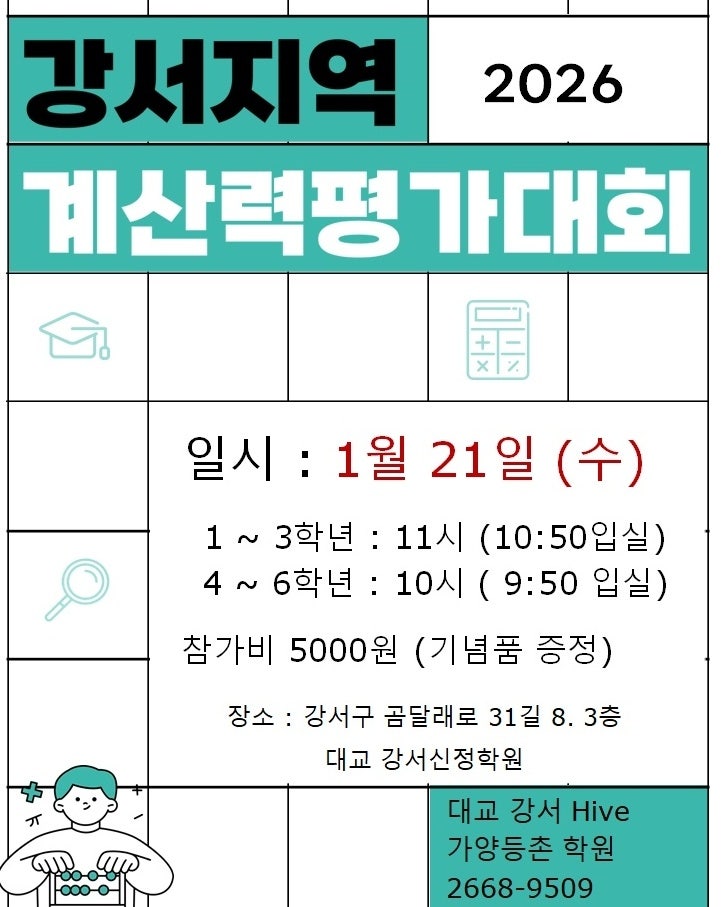 안녕하세요~~ 등현초 정문앞 대교 가양등촌학원입니다! 2월 본부 대회 출전 자격이 주어지는 강서 지역 '계산력 평가 대회'가 추운 날씨 가운데서도 열띤 성원에 힘입어 무탈하게 잘 끝났습니다. 이번 계산력 대회를 준비하면서 계산의 정확성과 신속성과 집중력은 계속된 훈련에 의해서만 가능하다는것을 새삼 느꼈습니다. '가양등촌학원'의 학년 대표 선수 15명이 참석한 이번 대회는 초1~초6까지 학년 대표 1명씩 선발하여 본부 대회에 참석하게 됩니다. 본원 수상자는 다음과 같습니다. 초1 이 * 안 초2 노 * 유 초4 김 * 빈 초5 오 * 운 6명을 뽑는 대회에서 4명이 본원생으로 열정을 갖고 준비하신 선생님과 아이들에....... <img src="https://blogthumb.pstatic.net/MjAyNjAxMjNfMTQw/MDAxNzY5MTMxNTI5NDc3.hs4G-91i0yU7F07VxWoaU-fc42_oJhNisruc3y8Nt44g.yJUJJIJ6o7ugelTMwD1ZpvytpXPnp2bttxQqPyquwZgg.JPEG/%B0%E8%BB%EA%B7%C2.jpg?type=s3" />