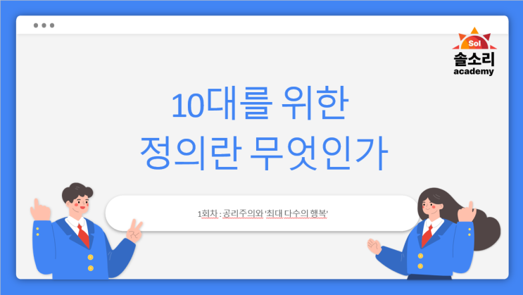 하버드 대 마이클 샌델 교수의 '정의수업'을 유투브 영상과 책을 통해 8회 수업으로 완성합니다! 첫 수업의 내용을 레슨 플랜과 공유해 드립니다. 오늘 첫 수업은 '정의란 무엇인가?' 그리고,공리주의와 다양한 예시를 통해 사상과 장/단점에 대해 질문지 작성한 것을 토대로 학생 중심의 수업을 진행했습니다. 초등 5학년이 되는 학생의 관점에서 예시를 정해 질문지를 작성했는데, 학생의 질문지 답변은 아래와 같습니다. 1. "정의롭다"는 것은 무엇일까? ( 친구들 사이에서 "그건 불공평해!"라고 느꼈던 경험이 있다면, 그 때 왜 그렇게 느꼈을까?) 초등 5학년이 되는 남학생 서우는 학급 회장 선거....... <img src="https://blogthumb.pstatic.net/MjAyNjAxMjNfOTIg/MDAxNzY5MTM1NDg3NDA2.88L0xECL7L7vJZs6BZN-pYK1N6FNeGeCxyP9DMglfVEg.HLFNxgyzwjvZ91SCo6giX_50UG-8rKbovmdDwJN4NEIg.PNG/%BE%EE%B8%B0%C0%CC%C3%B6%C7%D0_1%C8%B8%C2%F7.png?type=s3" />