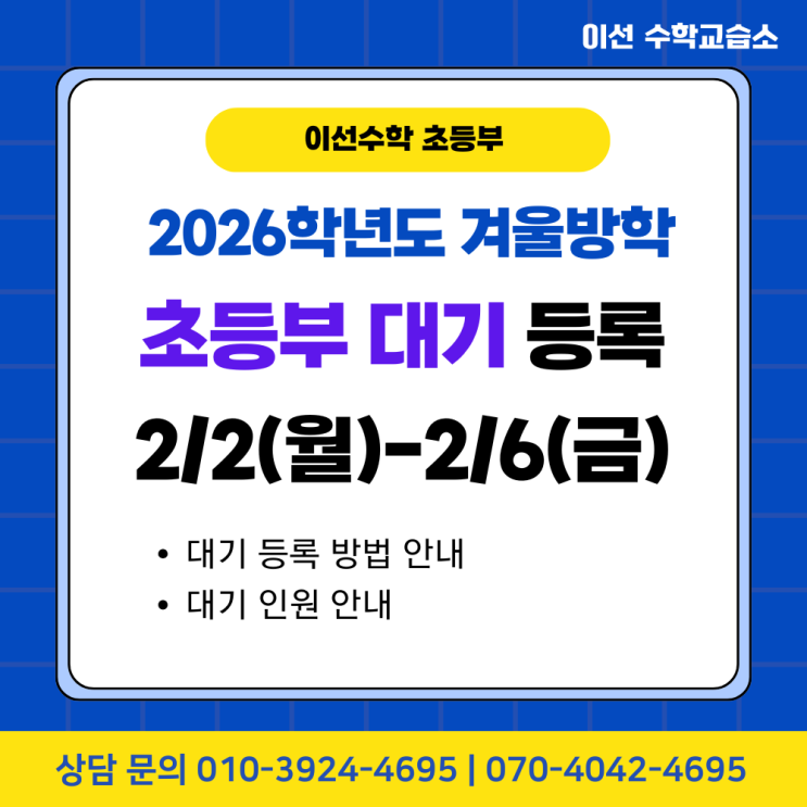 [이선수학 초등부] 2026학년도 대기 등록 기간 2/2(월)-2/6(금) (이후 1학기 대기 등록 마감 예정)