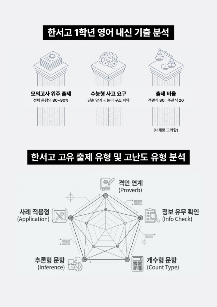 고등학교 영어 내신은 학교마다 출제 방식과 사고 요구 수준이 크게 다릅니다. 특히 한서고 영어 내신은 단순한 단어 암기나 문제풀이로 대비하기 어려운 시험입니다. 최근 한서고 1학년 영어 내신 기출을 분석해 보면 매우 뚜렷한 특징이 나타납니다. ✔ 모의고사 지문 중심 출제 ✔ 단순 암기보다 논리 구조 이해 중심 문제 ✔ 객관식 + 주관식 복합 평가 이러한 특징을 정확히 이해하지 못하면 공부는 많이 했는데 시험 점수는 기대만큼 나오지 않는 상황이 발생합니다. 그래서 저희는 기출 분석을 기반으로 한 내신 대비 수업을 진행하고 있습니다. 한서고 영어 시험의 핵심 특징 모의고사 중심 출제 한서고 영어 시험은 전체 문항의 약 80~9....... <img src="https://blogthumb.pstatic.net/MjAyNjAzMTNfNTIg/MDAxNzczMzg2ODU4ODE0.zJpT8wiuBMLZnT3DoYbe0s9QpUz9t8vi7UKZDvcpb6Ug.gJS_0Od2Q51FBffdKWS1etSH0N3PR4AfLvQHX9ZdDtEg.PNG/1.png?type=s3" />