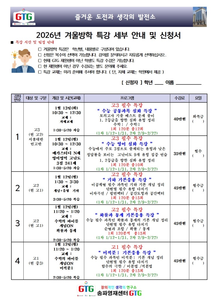 송파영재센터 GTG 2025~2026 겨울방학 특강 안내문