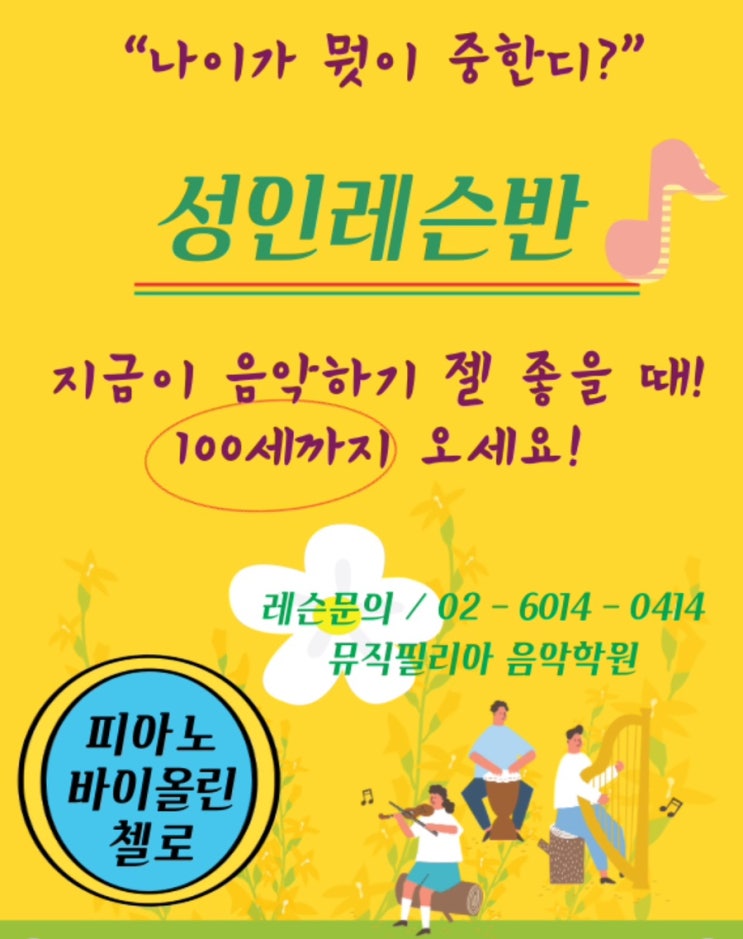 나이가 뭣이 중헌디? 나이 중요하죠. 중요합니다. 한 살이라도 젊을 때 뭐라도 배우는게 좋은거 맞습니다. 근데, 다들 잘 알고 계시겠지만, 내일보다는 오늘이 젊고 어리잖아요. 잘 알고 있지만, 몸이 움직이지 않는다면, 어른들만 다니는 성인음악학원 뮤직필리아가 등 떠밀어 드릴께요. 어떻게 밀어드릴지 아래에 이야기 풀어볼께요. 현재 뮤직필리아 최고령 학생은? 50대, 60대 시니어 연령의 분들이 레슨 오시면 많이 물어보세요. “지금 학원 다니는 수강생 중 가장 나이 많은 사람이 몇 살이에요?” “제가 가장 나이가 많은가요?” 저는 모든 분들의 나이를 알지는 못합니다. 개인적인 부분이라 먼저 말씀해주지 않으시면, 먼저 물어....... <img src="https://blogthumb.pstatic.net/MjAyNjAxMjJfMjQ0/MDAxNzY5MDA4NDgwNTEz.uRlg8JwWpUnL7fj57SD8oqow_S3pWvBk_vE65RmU7zQg.AuMCRdzIR9nkEcGiba5LSXvYvAUOLPvReb4EDIXYmCgg.JPEG/output%A3%DF800769499.jpg?type=s3" />