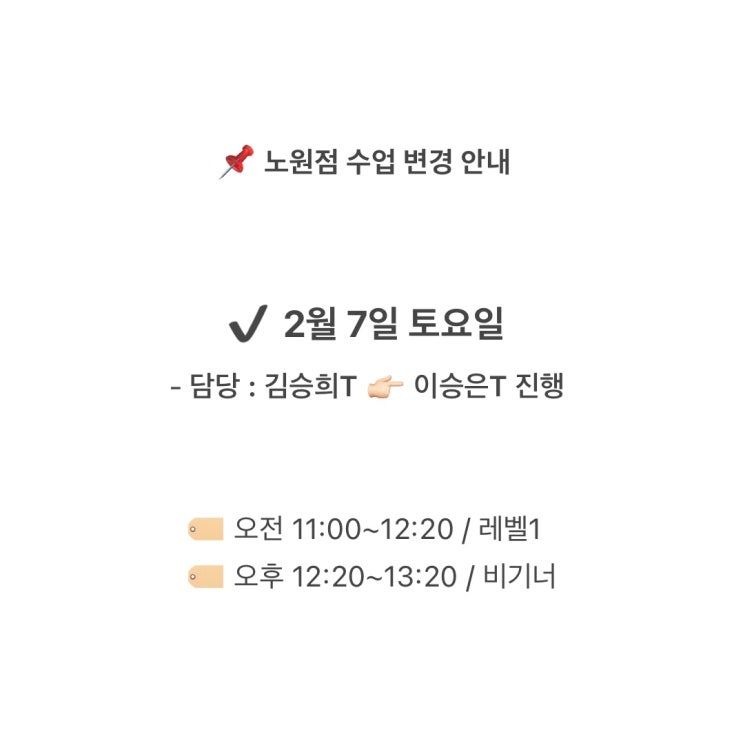 [ 2월 7일 토요일일 수업 변경 안내] 안녕하세요, 발레앤코입니다 2월 7일 토요일 오전<레벨1&비기너> 수업은 김승희 선생님 개인 사정으로 부득이하게 자리를 비우시게 되어 <이승은 선생님>이 진행합니다. 2월 7일 토요일 - 오전 11:00~12:20 / 레벨1 / 이승은 선생님 진행 - 오후 12:20~13:20 / 비기너 / 이승은 선생님 진행 수강생분들의 양해 부탁드립니다 ♀️ <img src="https://blogthumb.pstatic.net/MjAyNjAyMDNfMjk0/MDAxNzcwMDk5NDM0MDMy.GvzkuPDcGTUA6KTWAG-0lJzrrSVbtEuQb3s4YmP0aUAg.RomJKDN0zmEIki1WmY8Thcis7kxoKbf5d9AzsvCTEL4g.JPEG/KakaoTalk_20260203_151117658.jpg?type=s3" />