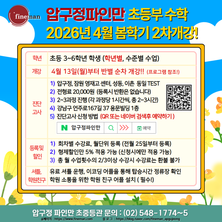 정신없던 신학기도 지나고 새로운 학년, 새로운 학급에도 적응해가는 시기입니다. 압구정파인만 학원은 초등부 학생들을 위한 봄학기 정규 수학 프로그램을 4월 13일(월)부터 2차 개강합니다. 이제부터 새로운 마음으로 수학학습에 집중하고자 하는 학생들에게 가장 효과적이고 체계적인 학습을 통해 심화와 수학 과정별 성취도를 동시에 잡을 수 있도록 구성되어 있는 프로그램입니다. ◆ 압구정파인만 초등부 수학 프로그램 소개 Fineman Care System ■ 풀이노트 √ 학원 내 매뉴얼에 따라 체계적으로 풀이노트 관리 √ 풀이 첨삭이 가능한 자체교재 √ 풀이노트 우수자 파인만 굿즈 포인트 지급 ■ 학원 친구 (Fine Diary) √ 수업 후 학습단....... <img src="https://blogthumb.pstatic.net/MjAyNjA0MDFfMjM3/MDAxNzc1MDIwOTk1MDE2.BxC8668Uh4PkRJzP19xCR32lasZUnl6Gbzd0w3B997kg.RXUrcnHAnIh2mpDPxqDhIGehlbz0n1hXg0vdY6M5s4Qg.PNG/%C3%CA%B5%EE_4%BF%F9_%B0%B3%B0%AD.png?type=s3" />