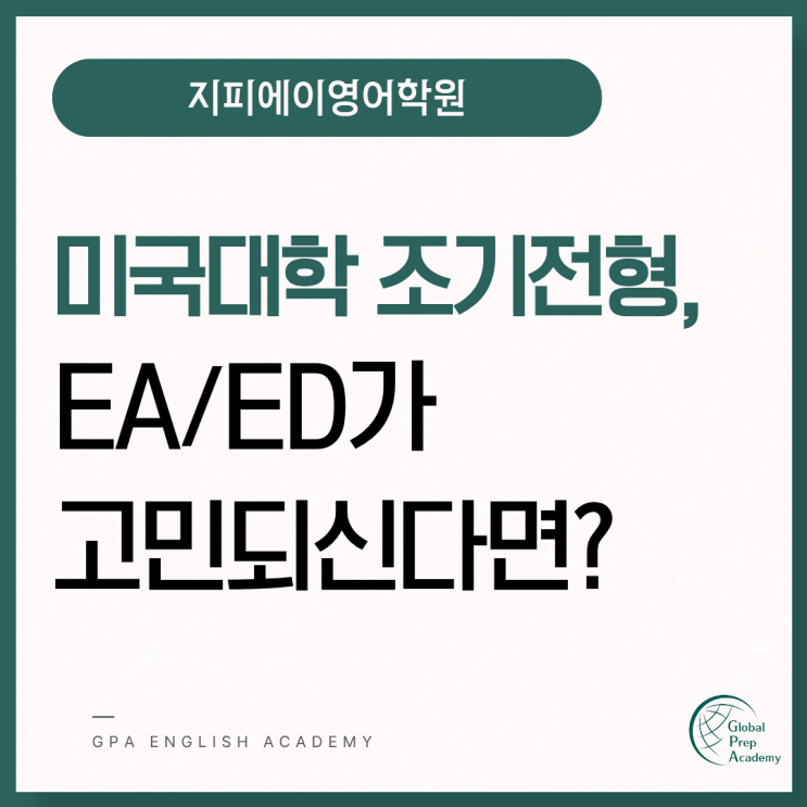 미국 유학을 준비할 때, 학부모님들께서 많이 하시는 질문이 있어요. 선생님, 저희 아이도 조기전형으로 준비해야 할까요? 같은 반 친구는 ED로 지원한다고 하니 덩달아 우리 아이까지 마음이 조급해지죠. 아마 지금도 "무조건 빨리 지원하는 게 유리한 걸까?" 라는 생각에 이 글을 읽고 계실 텐데요. 그래서 오늘은 지피에이영어학원이 11년간 입시 지도를 해온 경험을 바탕으로, 미국대학 조기전형을 둘러싼 핵심 내용을 말씀드리려고 합니다. 잠깐만 집중해서 읽어주신다면 사랑하는 자녀를 위한 입시 준비에 분명 도움이 되실 거예요.^^ 1. 미국대학 조기전형, ED/EA 무엇이 다른가요? 처음 미국 입시를 준비하다 보면 ED와 EA를 동....... <img src="https://blogthumb.pstatic.net/MjAyNjAzMzBfNTgg/MDAxNzc0ODc2Mzk1Mjkw.CNpGQrplQr0yYQYTTx3upw4AvdVPkGiAo6ivKnuvGd4g.xqFGcSuS77MGJHASbay_dcBqNWcrZ_CVI1RV22lIPysg.PNG/1.png?type=s3" />