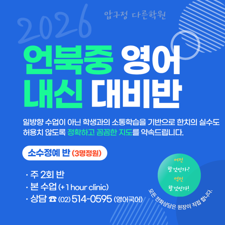 원장이 드리는 말씀 같은 학년이라도 이해가 자리 잡는 속도는 다릅니다. 어떤 학생은 한 번 설명하면 바로 적용하지만, 어떤 학생은 예문을 두세 번 바꿔 보며 익혀야 자기 것이 됩니다. 수업에서는 진도를 무조건 앞으로만 밀지 않습니다. 시험 범위 안에서라도 제대로 이해한 뒤 넘어가는 것이 더 중요하기 때문입니다. 억지로 맞춘 채 지나가면 다음 단원에서 더 크게 흔들리게 됩니다. 빠른 진도보다 중요한 건 이해가 남는 속도로 배우는 것입니다 안녕하세요~ 소수정예 영어·국어 전문 압구정 다른학원 원장입니다. 저희는 학생 개개인의 학습 과정을 꼼꼼히 관찰하고 학부모님과 지속적으로 공유하는 것을 중요하게 생각....... <img src="https://blogthumb.pstatic.net/MjAyNjAzMzFfMTAg/MDAxNzc0OTE2NjY5NjEz.xfxiWUr3-fxaI3VLXeLJEygLd4JgmRrsH5hX3iVYZRog.CqRCvoyy3p5oSRDPkCPreqoZmqNEYGB3PCCwFKSjWC4g.PNG/%BE%F0%BA%CF%C1%DF.png?type=s3" />